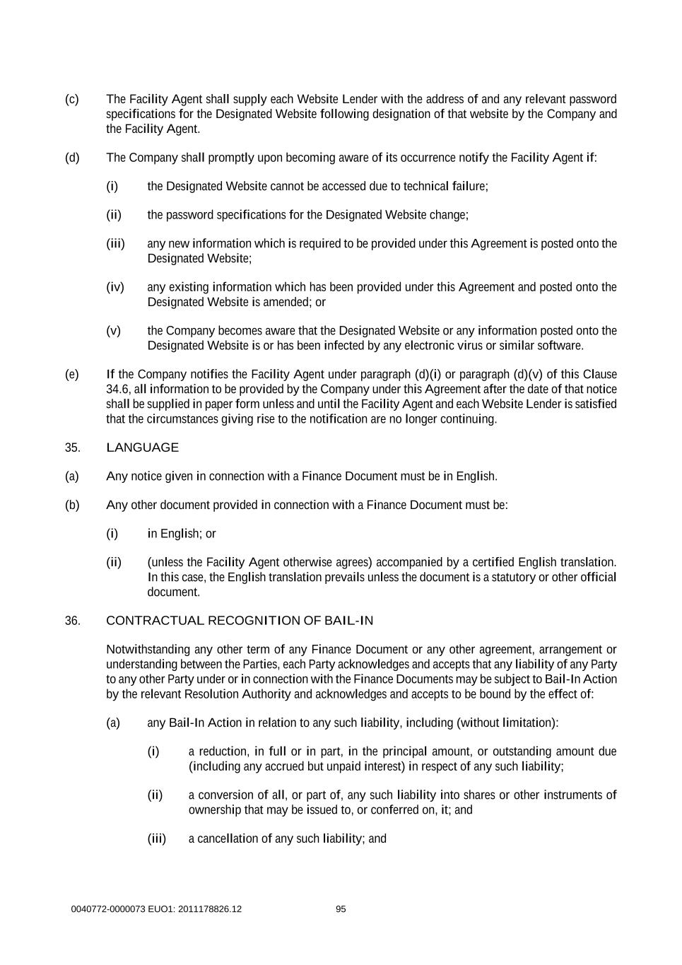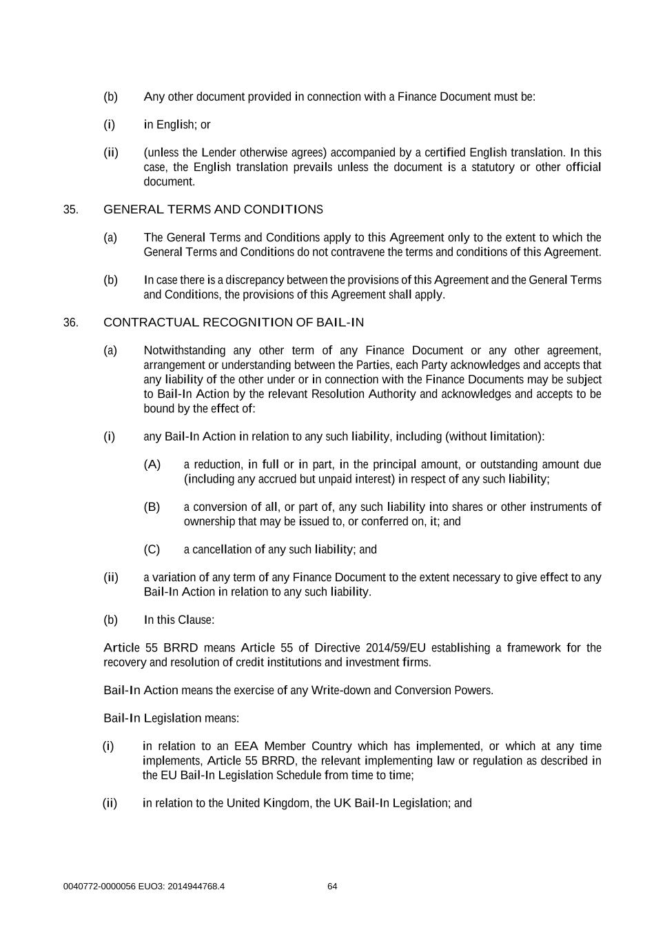 0040772-0000056 EUO3: 2014944768.4 64 (b) Any other document provided in connection with a Finance Document must be: (i) in English; or (ii) (unless the Lender otherwise agrees) accompanied by a certified English translation. In this case, the English translation prevails unless the document is a statutory or other official document. 35. GENERAL TERMS AND CONDITIONS (a) The General Terms and Conditions apply to this Agreement only to the extent to which the General Terms and Conditions do not contravene the terms and conditions of this Agreement. (b) In case there is a discrepancy between the provisions of this Agreement and the General Terms and Conditions, the provisions of this Agreement shall apply. 36. CONTRACTUAL RECOGNITION OF BAIL-IN (a) Notwithstanding any other term of any Finance Document or any other agreement, arrangement or understanding between the Parties, each Party acknowledges and accepts that any liability of the other under or in connection with the Finance Documents may be subject to Bail-In Action by the relevant Resolution Authority and acknowledges and accepts to be bound by the effect of: (i) any Bail-In Action in relation to any such liability, including (without limitation): (A) a reduction, in full or in part, in the principal amount, or outstanding amount due (including any accrued but unpaid interest) in respect of any such liability; (B) a conversion of all, or part of, any such liability into shares or other instruments of ownership that may be issued to, or conferred on, it; and (C) a cancellation of any such liability; and (ii) a variation of any term of any Finance Document to the extent necessary to give effect to any Bail-In Action in relation to any such liability. (b) In this Clause: Article 55 BRRD means Article 55 of Directive 2014/59/EU establishing a framework for the recovery and resolution of credit institutions and investment firms. Bail-In Action means the exercise of any Write-down and Conversion Powers. Bail-In Legislation means: (i) in relation to an EEA Member Country which has implemented, or which at any time implements, Article 55 BRRD, the relevant implementing law or regulation as described in the EU Bail-In Legislation Schedule from time to time; (ii) in relation to the United Kingdom, the UK Bail-In Legislation; and