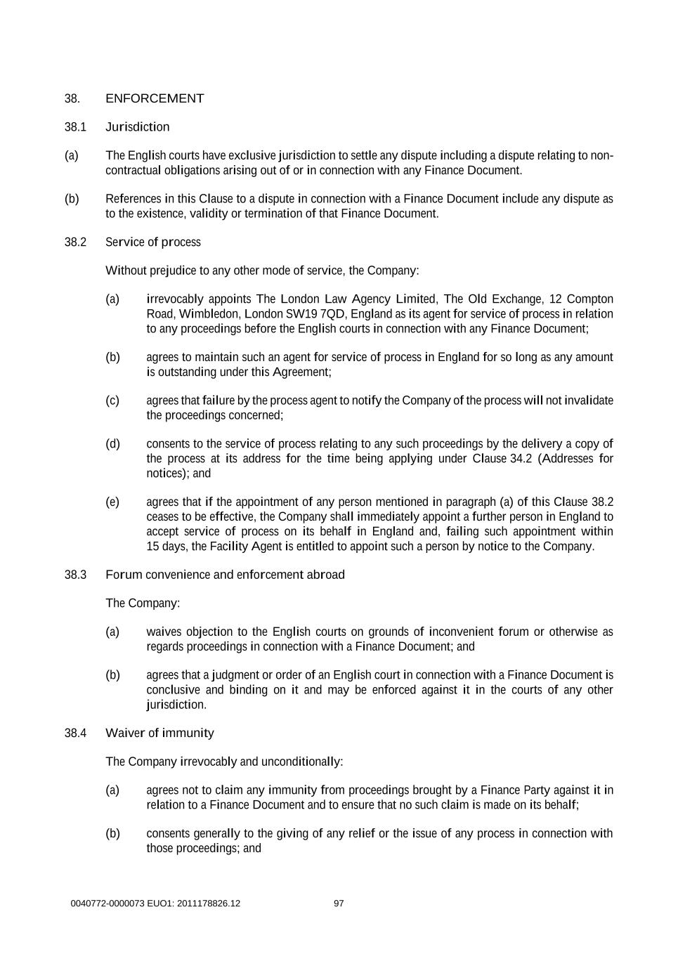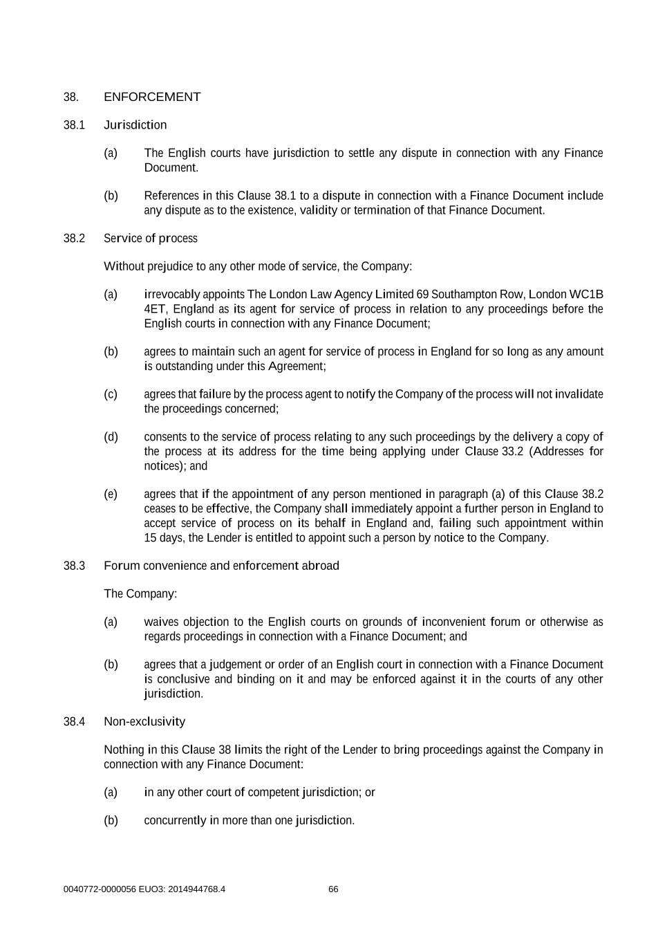 0040772-0000056 EUO3: 2014944768.4 66 38. ENFORCEMENT 38.1 Jurisdiction (a) The English courts have jurisdiction to settle any dispute in connection with any Finance Document. (b) References in this Clause 38.1 to a dispute in connection with a Finance Document include any dispute as to the existence, validity or termination of that Finance Document. 38.2 Service of process Without prejudice to any other mode of service, the Company: (a) irrevocably appoints The London Law Agency Limited 69 Southampton Row, London WC1B 4ET, England as its agent for service of process in relation to any proceedings before the English courts in connection with any Finance Document; (b) agrees to maintain such an agent for service of process in England for so long as any amount is outstanding under this Agreement; (c) agrees that failure by the process agent to notify the Company of the process will not invalidate the proceedings concerned; (d) consents to the service of process relating to any such proceedings by the delivery a copy of the process at its address for the time being applying under Clause 33.2 (Addresses for notices); and (e) agrees that if the appointment of any person mentioned in paragraph (a) of this Clause 38.2 ceases to be effective, the Company shall immediately appoint a further person in England to accept service of process on its behalf in England and, failing such appointment within 15 days, the Lender is entitled to appoint such a person by notice to the Company. 38.3 Forum convenience and enforcement abroad The Company: (a) waives objection to the English courts on grounds of inconvenient forum or otherwise as regards proceedings in connection with a Finance Document; and (b) agrees that a judgement or order of an English court in connection with a Finance Document is conclusive and binding on it and may be enforced against it in the courts of any other jurisdiction. 38.4 Non-exclusivity Nothing in this Clause 38 limits the right of the Lender to bring proceedings against the Company in connection with any Finance Document: (a) in any other court of competent jurisdiction; or (b) concurrently in more than one jurisdiction.