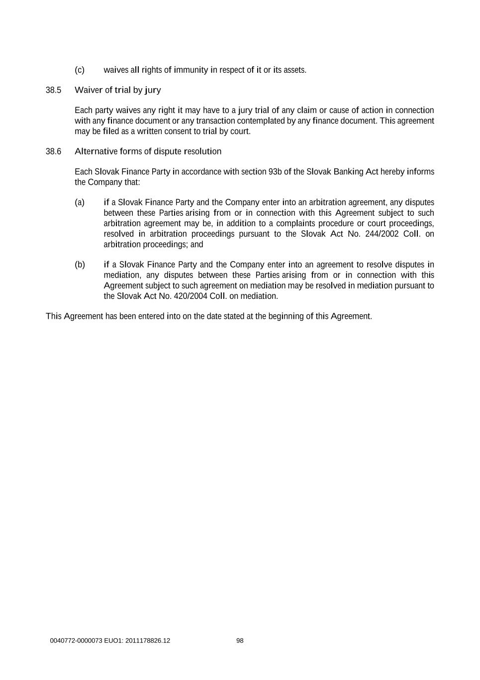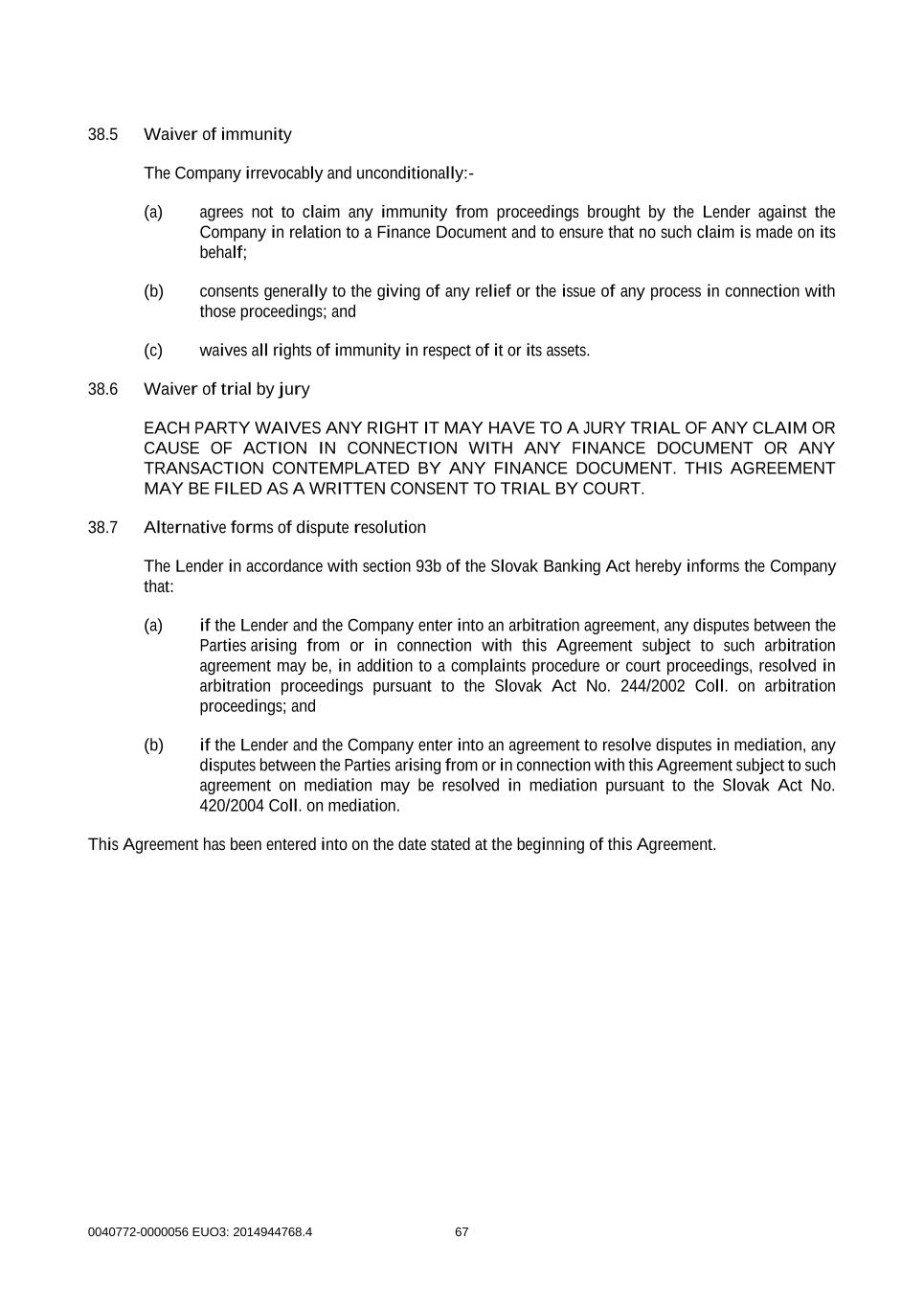 0040772-0000056 EUO3: 2014944768.4 67 38.5 Waiver of immunity The Company irrevocably and unconditionally:- (a) agrees not to claim any immunity from proceedings brought by the Lender against the Company in relation to a Finance Document and to ensure that no such claim is made on its behalf; (b) consents generally to the giving of any relief or the issue of any process in connection with those proceedings; and (c) waives all rights of immunity in respect of it or its assets. 38.6 Waiver of trial by jury EACH PARTY WAIVES ANY RIGHT IT MAY HAVE TO A JURY TRIAL OF ANY CLAIM OR CAUSE OF ACTION IN CONNECTION WITH ANY FINANCE DOCUMENT OR ANY TRANSACTION CONTEMPLATED BY ANY FINANCE DOCUMENT. THIS AGREEMENT MAY BE FILED AS A WRITTEN CONSENT TO TRIAL BY COURT. 38.7 Alternative forms of dispute resolution The Lender in accordance with section 93b of the Slovak Banking Act hereby informs the Company that: (a) if the Lender and the Company enter into an arbitration agreement, any disputes between the Parties arising from or in connection with this Agreement subject to such arbitration agreement may be, in addition to a complaints procedure or court proceedings, resolved in arbitration proceedings pursuant to the Slovak Act No. 244/2002 Coll. on arbitration proceedings; and (b) if the Lender and the Company enter into an agreement to resolve disputes in mediation, any disputes between the Parties arising from or in connection with this Agreement subject to such agreement on mediation may be resolved in mediation pursuant to the Slovak Act No. 420/2004 Coll. on mediation. This Agreement has been entered into on the date stated at the beginning of this Agreement.