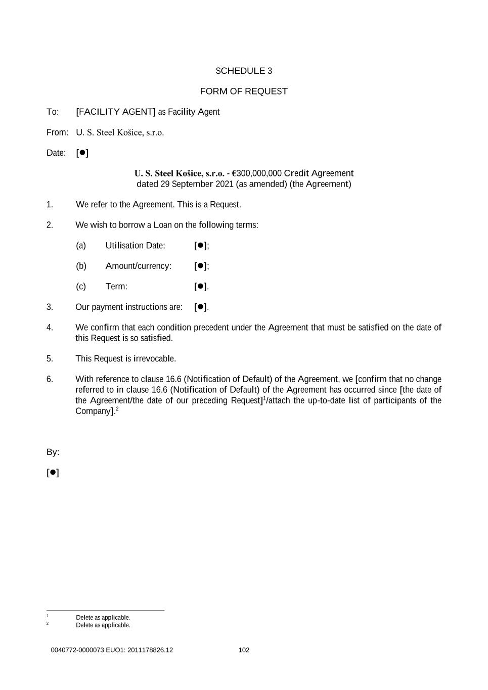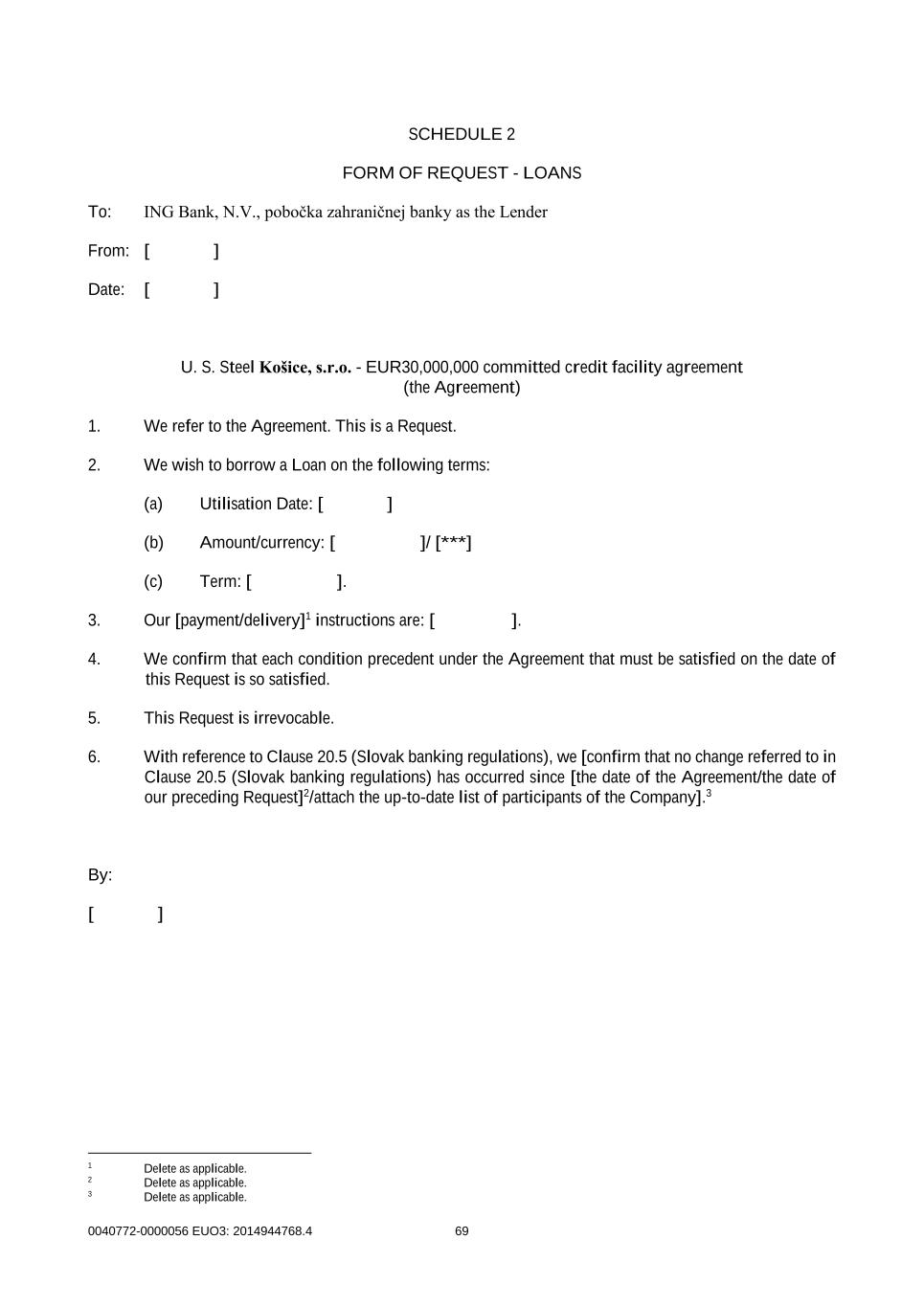 0040772-0000056 EUO3: 2014944768.4 69 SCHEDULE 2 FORM OF REQUEST - LOANS To: ING Bank, N.V., pobočka zahraničnej banky as the Lender From: [ ] Date: [ ] U. S. Steel Košice, s.r.o. - EUR30,000,000 committed credit facility agreement (the Agreement) 1. We refer to the Agreement. This is a Request. 2. We wish to borrow a Loan on the following terms: (a) Utilisation Date: [ ] (b) Amount/currency: [ ]/ [***] (c) Term: [ ]. 3. Our [payment/delivery]1 instructions are: [ ]. 4. We confirm that each condition precedent under the Agreement that must be satisfied on the date of this Request is so satisfied. 5. This Request is irrevocable. 6. With reference to Clause 20.5 (Slovak banking regulations), we [confirm that no change referred to in Clause 20.5 (Slovak banking regulations) has occurred since [the date of the Agreement/the date of our preceding Request]2/attach the up-to-date list of participants of the Company].3 By: [ ] 1 Delete as applicable. 2 Delete as applicable. 3 Delete as applicable.
