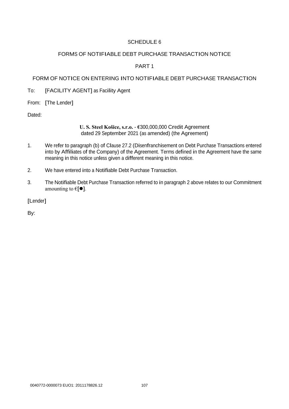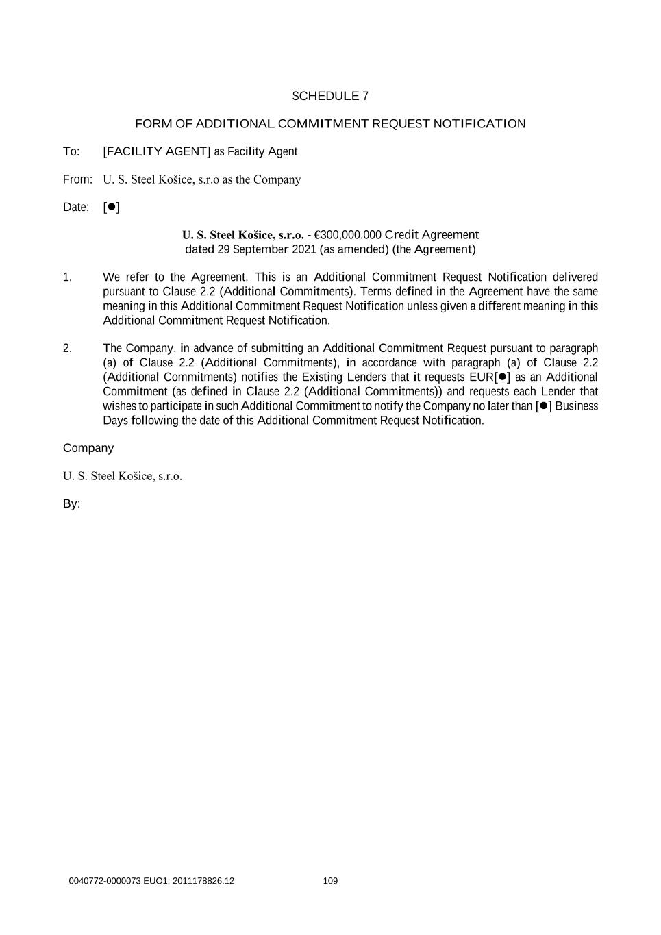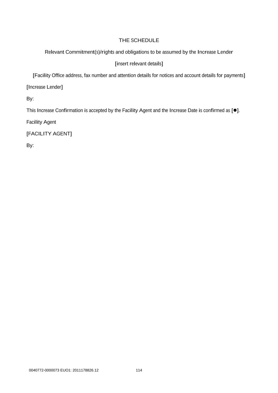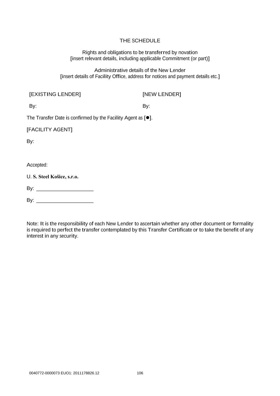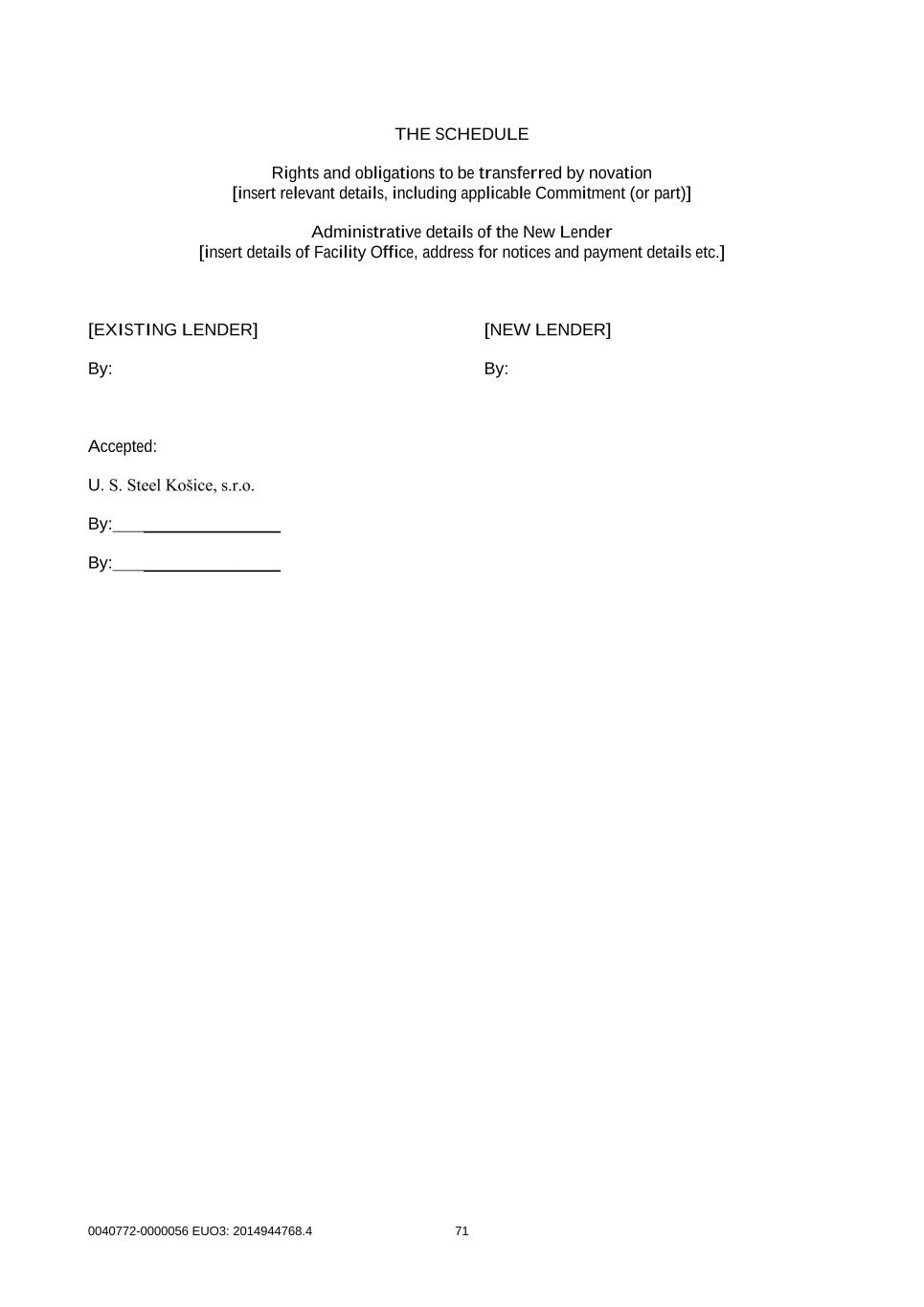 0040772-0000056 EUO3: 2014944768.4 71 THE SCHEDULE Rights and obligations to be transferred by novation [insert relevant details, including applicable Commitment (or part)] Administrative details of the New Lender [insert details of Facility Office, address for notices and payment details etc.] [EXISTING LENDER] [NEW LENDER] By: By: Accepted: U. S. Steel Košice, s.r.o. By: ________________ By: ________________