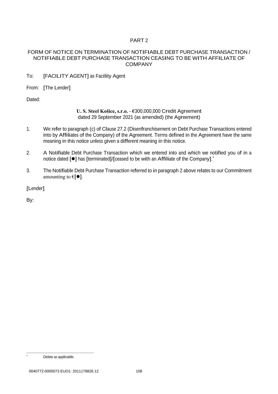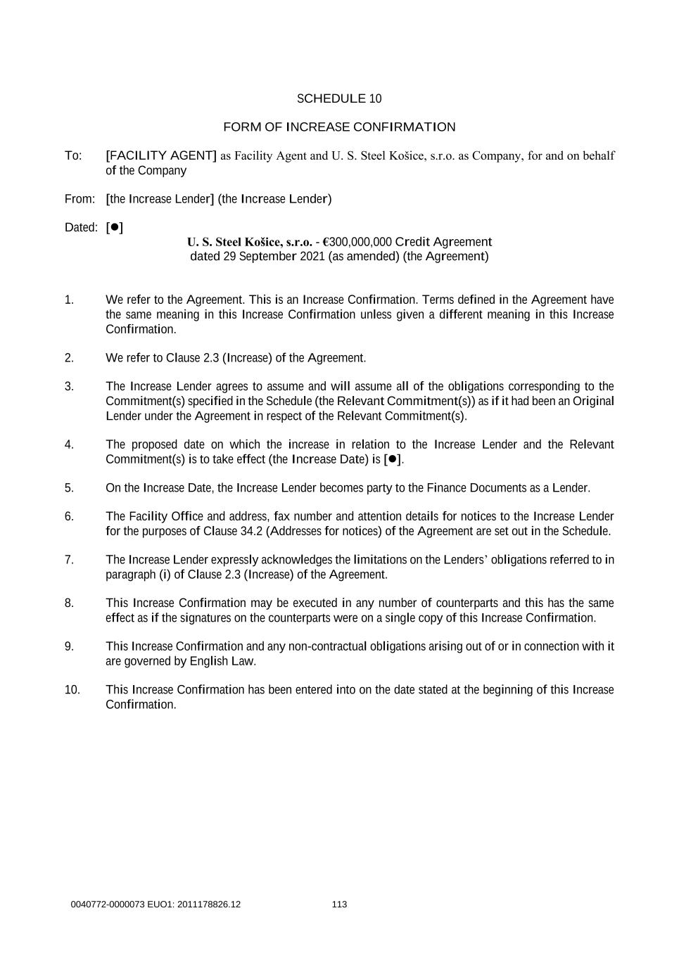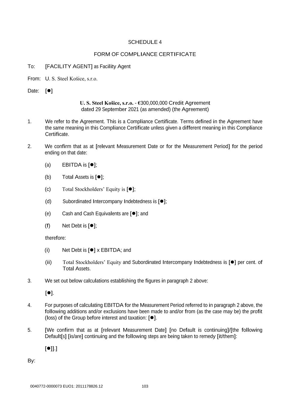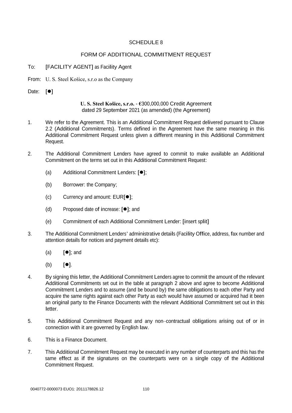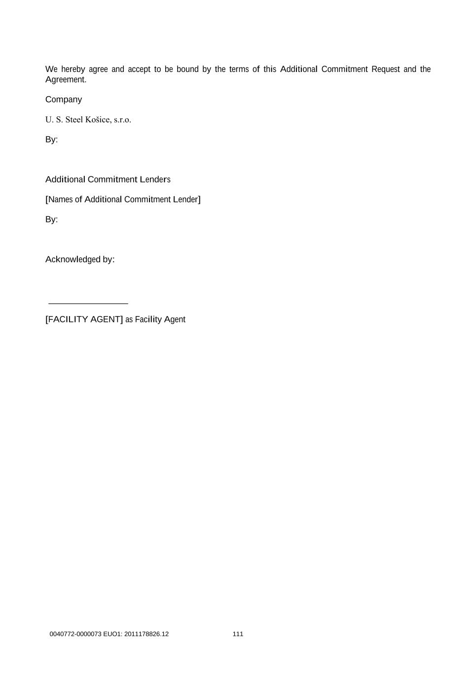 0040772-0000056 EUO3: 2014944768.4 71 THE SCHEDULE Rights and obligations to be transferred by novation [insert relevant details, including applicable Commitment (or part)] Administrative details of the New Lender [insert details of Facility Office, address for notices and payment details etc.] [EXISTING LENDER] [NEW LENDER] By: By: Accepted: U. S. Steel Košice, s.r.o. By: ________________ By: ________________