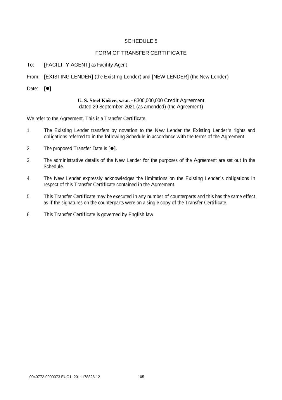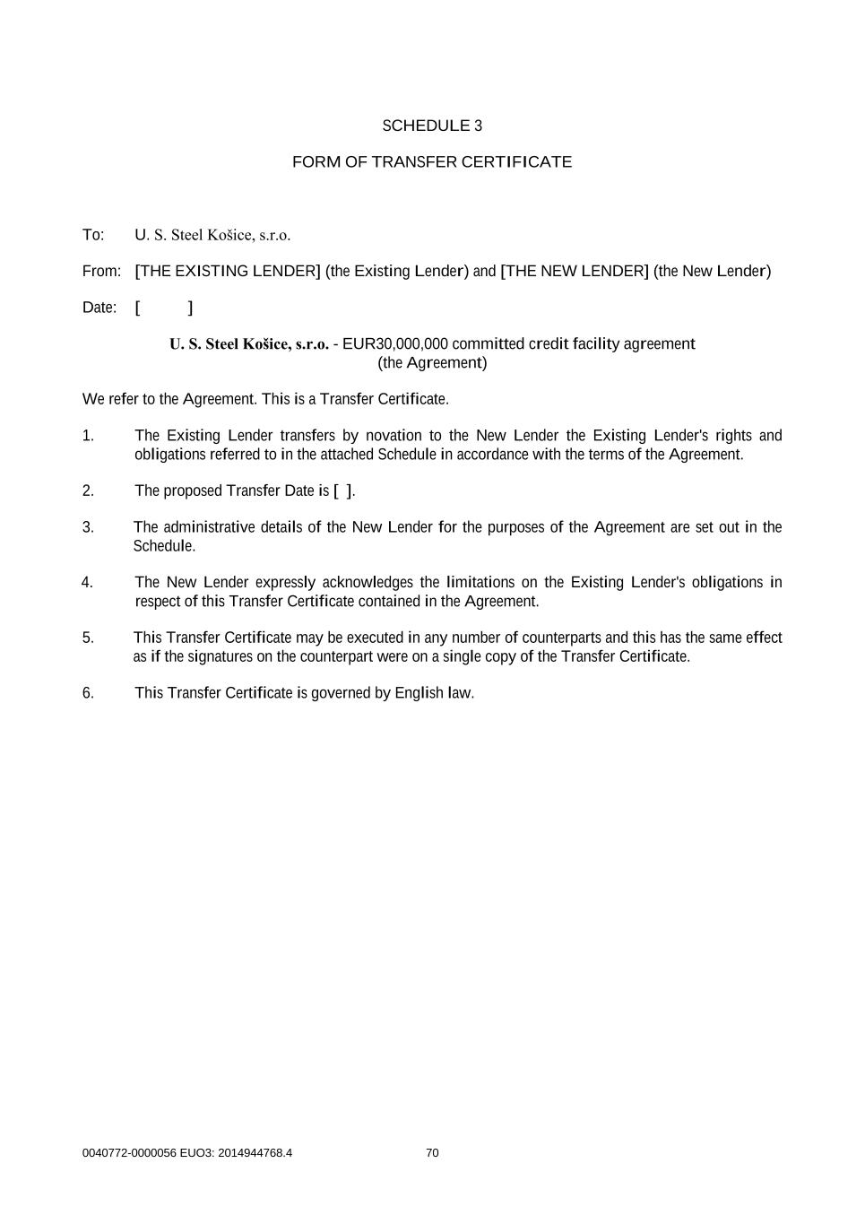 0040772-0000056 EUO3: 2014944768.4 70 SCHEDULE 3 FORM OF TRANSFER CERTIFICATE To: U. S. Steel Košice, s.r.o. From: [THE EXISTING LENDER] (the Existing Lender) and [THE NEW LENDER] (the New Lender) Date: [ ] U. S. Steel Košice, s.r.o. - EUR30,000,000 committed credit facility agreement (the Agreement) We refer to the Agreement. This is a Transfer Certificate. 1. The Existing Lender transfers by novation to the New Lender the Existing Lender's rights and obligations referred to in the attached Schedule in accordance with the terms of the Agreement. 2. The proposed Transfer Date is [ ]. 3. The administrative details of the New Lender for the purposes of the Agreement are set out in the Schedule. 4. The New Lender expressly acknowledges the limitations on the Existing Lender's obligations in respect of this Transfer Certificate contained in the Agreement. 5. This Transfer Certificate may be executed in any number of counterparts and this has the same effect as if the signatures on the counterpart were on a single copy of the Transfer Certificate. 6. This Transfer Certificate is governed by English law.