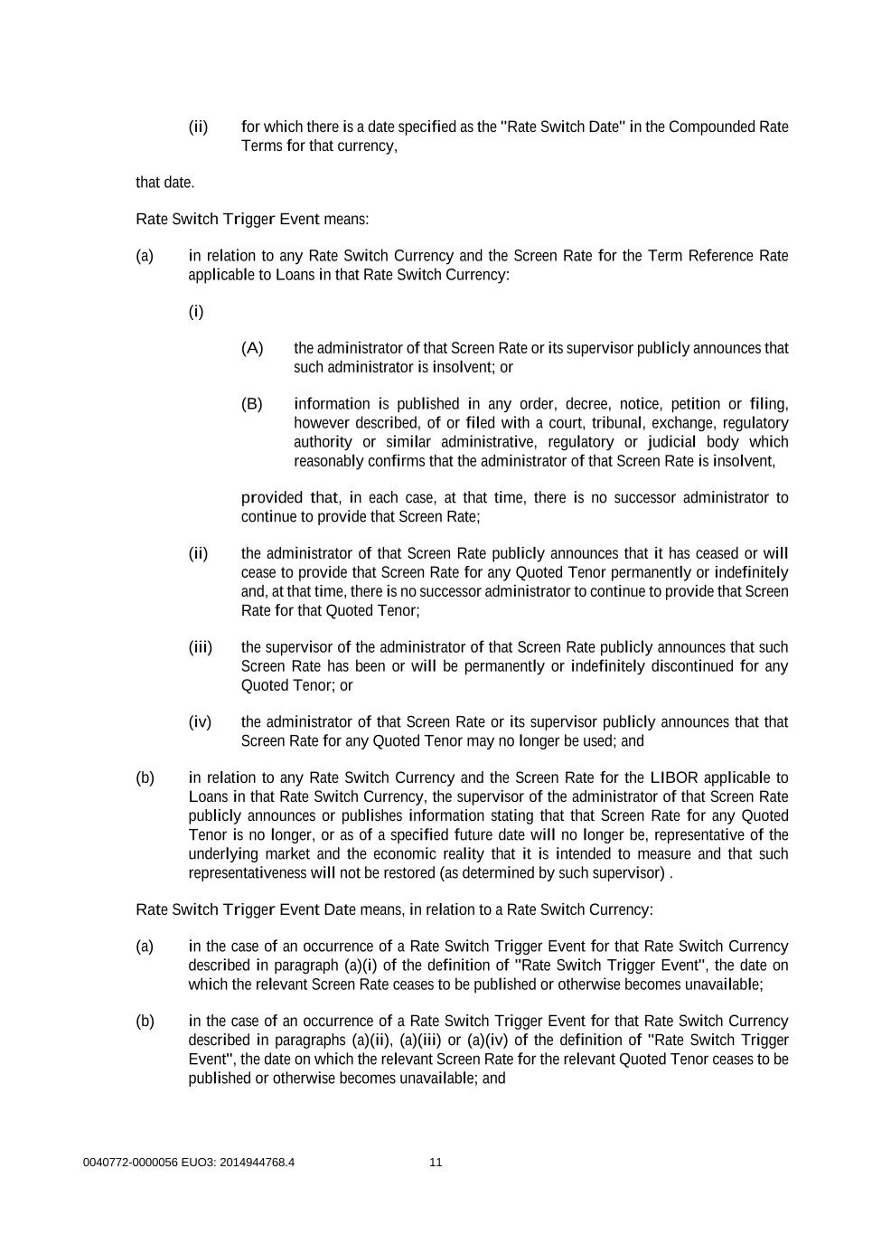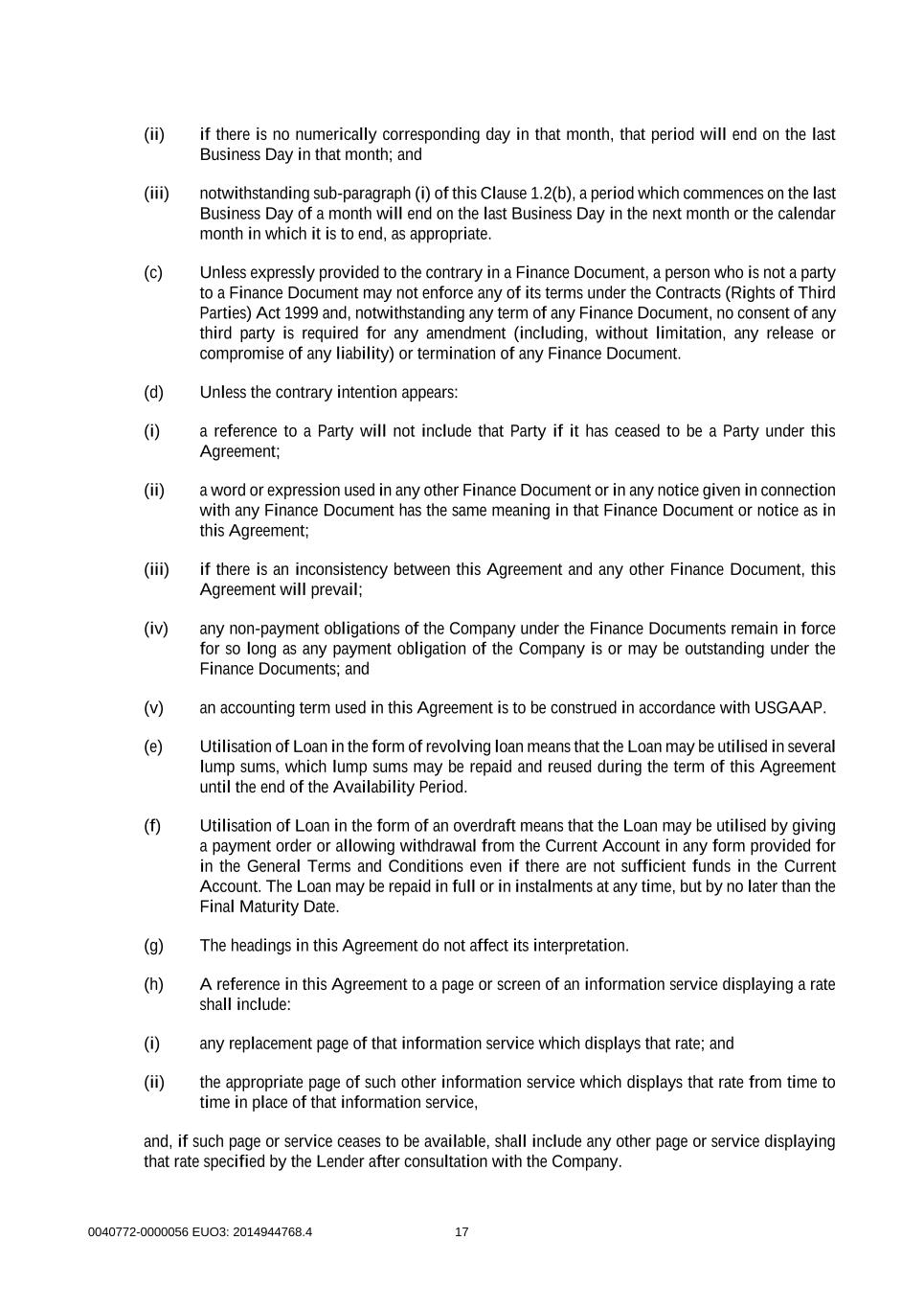 0040772-0000056 EUO3: 2014944768.4 33 11A.2 Delayed switch for existing Term Rate Overdrafts and Term Rate Revolving Loans If the Rate Switch Date for a Rate Switch Currency falls before the last day of a Term for Term Rate Overdraft or Term Rate Revolving Loan in that currency: (a) that Loan or Overdraft shall continue to be a Term Rate Overdraft or Term Rate Revolving Loan for that Term and Clause 12.1 (Calculation of interest – Term Rate Revolving Loan) or Clause 12.2 (Calculation of interest – Term Rate Overdraft), as applicable, shall continue to apply to that Loan for that Term; (b) any provision of this Agreement which is expressed to relate to a Compounded Rate Currency shall not apply in relation to that Loan for that Term; and (c) on and from the first day of the next Term (if any) for that Loan: (i) that Loan shall be a "Compounded Rate Loan"; and (ii) Clause 12.3 (Calculation of interest – Compounded Rate Loans) shall apply to that Loan. 11A.3 Notifications by the Lender (a) Subject to paragraph (c) below, following the occurrence of a Rate Switch Trigger Event for a Rate Switch Currency, the Lender shall: (i) promptly upon becoming aware of the occurrence of that Rate Switch Trigger Event, notify the Company of that occurrence; and (ii) promptly upon becoming aware of the date of the Rate Switch Trigger Event Date applicable to that Rate Switch Trigger Event, notify the Company of that date. (b) The Lender shall, promptly upon becoming aware of the occurrence of the Rate Switch Date for a Rate Switch Currency, notify the Company of that occurrence. (c) The Parties agree that the FCA Cessation Announcement constitutes a Rate Switch Trigger Event in relation to USD, that the Rate Switch Trigger Event Date applicable to such Rate Switch Trigger Event in relation to USD will be 30 June 2023 and that the Lender is not under any obligation under paragraph (a) above to notify the Company of such Rate Switch Trigger Event or Rate Switch Trigger Event Date resulting from the FCA Cessation Announcement. (d) For the purposes of paragraph (c) above, the "FCA Cessation Announcement" means the announcement on 5 March 2021 by the UK's Financial Conduct Authority that all LIBOR settings will, as of certain specified future dates, either cease to be provided by any administrator or no longer be representative of the market and economic reality that they are intended to measure and that such representativeness will not be restored. 12. INTEREST 12.1 Calculation of interest – Term Rate Revolving Loan The rate of interest on each Term Rate Revolving Loan for its Term is the percentage rate per annum equal to the aggregate of the applicable: (a) Margin; and
