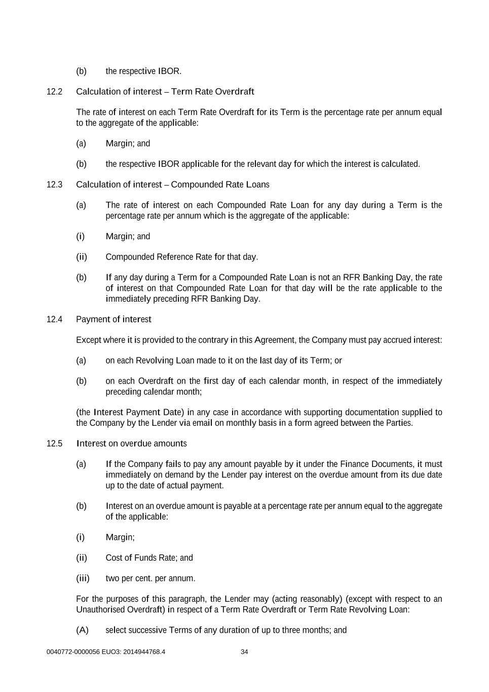 0040772-0000056 EUO3: 2014944768.4 34 (b) the respective IBOR. 12.2 Calculation of interest – Term Rate Overdraft The rate of interest on each Term Rate Overdraft for its Term is the percentage rate per annum equal to the aggregate of the applicable: (a) Margin; and (b) the respective IBOR applicable for the relevant day for which the interest is calculated. 12.3 Calculation of interest – Compounded Rate Loans (a) The rate of interest on each Compounded Rate Loan for any day during a Term is the percentage rate per annum which is the aggregate of the applicable: (i) Margin; and (ii) Compounded Reference Rate for that day. (b) If any day during a Term for a Compounded Rate Loan is not an RFR Banking Day, the rate of interest on that Compounded Rate Loan for that day will be the rate applicable to the immediately preceding RFR Banking Day. 12.4 Payment of interest Except where it is provided to the contrary in this Agreement, the Company must pay accrued interest: (a) on each Revolving Loan made to it on the last day of its Term; or (b) on each Overdraft on the first day of each calendar month, in respect of the immediately preceding calendar month; (the Interest Payment Date) in any case in accordance with supporting documentation supplied to the Company by the Lender via email on monthly basis in a form agreed between the Parties. 12.5 Interest on overdue amounts (a) If the Company fails to pay any amount payable by it under the Finance Documents, it must immediately on demand by the Lender pay interest on the overdue amount from its due date up to the date of actual payment. (b) Interest on an overdue amount is payable at a percentage rate per annum equal to the aggregate of the applicable: (i) Margin; (ii) Cost of Funds Rate; and (iii) two per cent. per annum. For the purposes of this paragraph, the Lender may (acting reasonably) (except with respect to an Unauthorised Overdraft) in respect of a Term Rate Overdraft or Term Rate Revolving Loan: (A) select successive Terms of any duration of up to three months; and