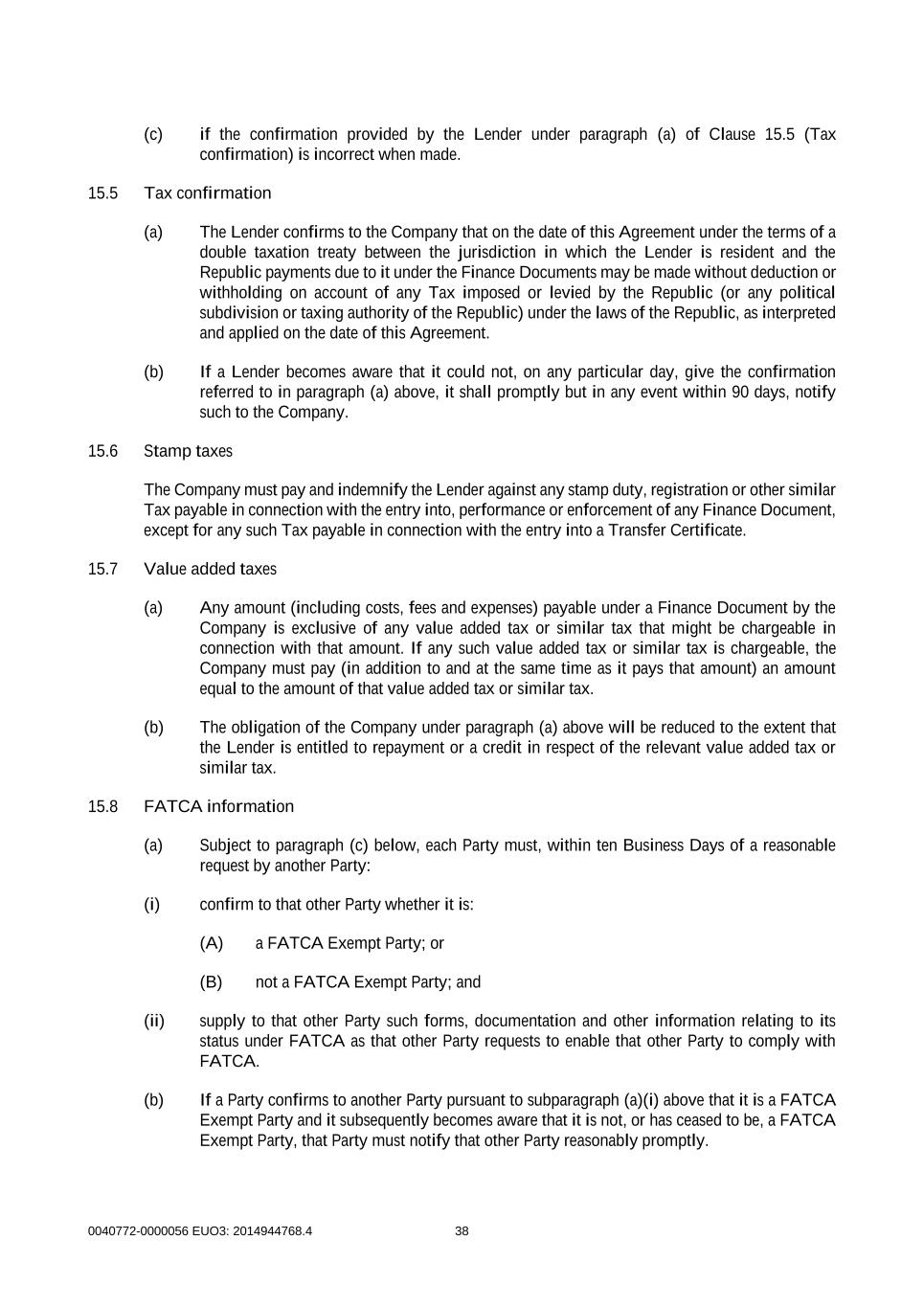 0040772-0000056 EUO3: 2014944768.4 38 (c) if the confirmation provided by the Lender under paragraph (a) of Clause 15.5 (Tax confirmation) is incorrect when made. 15.5 Tax confirmation (a) The Lender confirms to the Company that on the date of this Agreement under the terms of a double taxation treaty between the jurisdiction in which the Lender is resident and the Republic payments due to it under the Finance Documents may be made without deduction or withholding on account of any Tax imposed or levied by the Republic (or any political subdivision or taxing authority of the Republic) under the laws of the Republic, as interpreted and applied on the date of this Agreement. (b) If a Lender becomes aware that it could not, on any particular day, give the confirmation referred to in paragraph (a) above, it shall promptly but in any event within 90 days, notify such to the Company. 15.6 Stamp taxes The Company must pay and indemnify the Lender against any stamp duty, registration or other similar Tax payable in connection with the entry into, performance or enforcement of any Finance Document, except for any such Tax payable in connection with the entry into a Transfer Certificate. 15.7 Value added taxes (a) Any amount (including costs, fees and expenses) payable under a Finance Document by the Company is exclusive of any value added tax or similar tax that might be chargeable in connection with that amount. If any such value added tax or similar tax is chargeable, the Company must pay (in addition to and at the same time as it pays that amount) an amount equal to the amount of that value added tax or similar tax. (b) The obligation of the Company under paragraph (a) above will be reduced to the extent that the Lender is entitled to repayment or a credit in respect of the relevant value added tax or similar tax. 15.8 FATCA information (a) Subject to paragraph (c) below, each Party must, within ten Business Days of a reasonable request by another Party: (i) confirm to that other Party whether it is: (A) a FATCA Exempt Party; or (B) not a FATCA Exempt Party; and (ii) supply to that other Party such forms, documentation and other information relating to its status under FATCA as that other Party requests to enable that other Party to comply with FATCA. (b) If a Party confirms to another Party pursuant to subparagraph (a)(i) above that it is a FATCA Exempt Party and it subsequently becomes aware that it is not, or has ceased to be, a FATCA Exempt Party, that Party must notify that other Party reasonably promptly.
