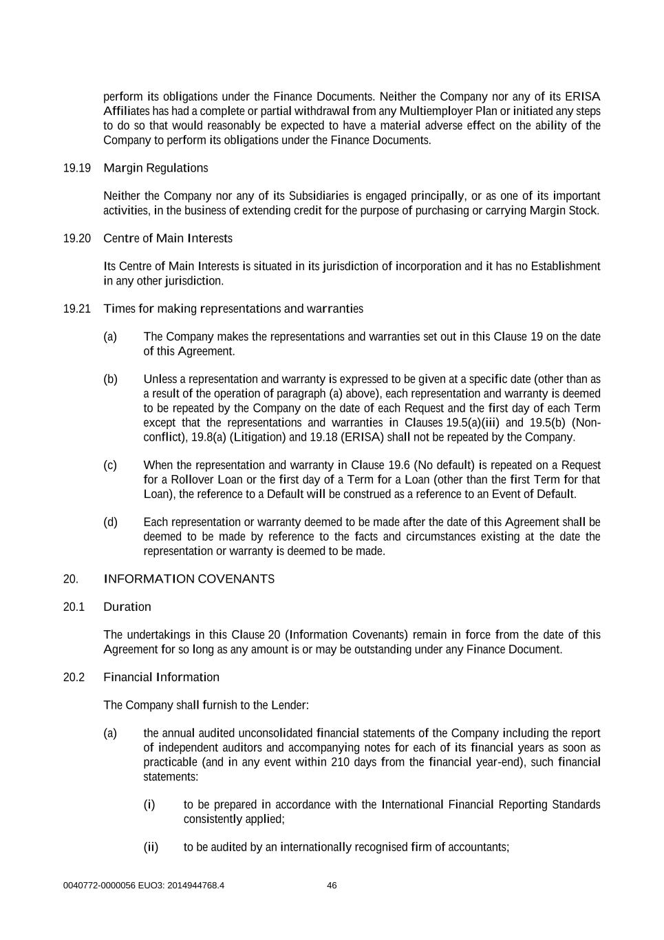 0040772-0000056 EUO3: 2014944768.4 46 perform its obligations under the Finance Documents. Neither the Company nor any of its ERISA Affiliates has had a complete or partial withdrawal from any Multiemployer Plan or initiated any steps to do so that would reasonably be expected to have a material adverse effect on the ability of the Company to perform its obligations under the Finance Documents. 19.19 Margin Regulations Neither the Company nor any of its Subsidiaries is engaged principally, or as one of its important activities, in the business of extending credit for the purpose of purchasing or carrying Margin Stock. 19.20 Centre of Main Interests Its Centre of Main Interests is situated in its jurisdiction of incorporation and it has no Establishment in any other jurisdiction. 19.21 Times for making representations and warranties (a) The Company makes the representations and warranties set out in this Clause 19 on the date of this Agreement. (b) Unless a representation and warranty is expressed to be given at a specific date (other than as a result of the operation of paragraph (a) above), each representation and warranty is deemed to be repeated by the Company on the date of each Request and the first day of each Term except that the representations and warranties in Clauses 19.5(a)(iii) and 19.5(b) (Non- conflict), 19.8(a) (Litigation) and 19.18 (ERISA) shall not be repeated by the Company. (c) When the representation and warranty in Clause 19.6 (No default) is repeated on a Request for a Rollover Loan or the first day of a Term for a Loan (other than the first Term for that Loan), the reference to a Default will be construed as a reference to an Event of Default. (d) Each representation or warranty deemed to be made after the date of this Agreement shall be deemed to be made by reference to the facts and circumstances existing at the date the representation or warranty is deemed to be made. 20. INFORMATION COVENANTS 20.1 Duration The undertakings in this Clause 20 (Information Covenants) remain in force from the date of this Agreement for so long as any amount is or may be outstanding under any Finance Document. 20.2 Financial Information The Company shall furnish to the Lender: (a) the annual audited unconsolidated financial statements of the Company including the report of independent auditors and accompanying notes for each of its financial years as soon as practicable (and in any event within 210 days from the financial year-end), such financial statements: (i) to be prepared in accordance with the International Financial Reporting Standards consistently applied; (ii) to be audited by an internationally recognised firm of accountants;