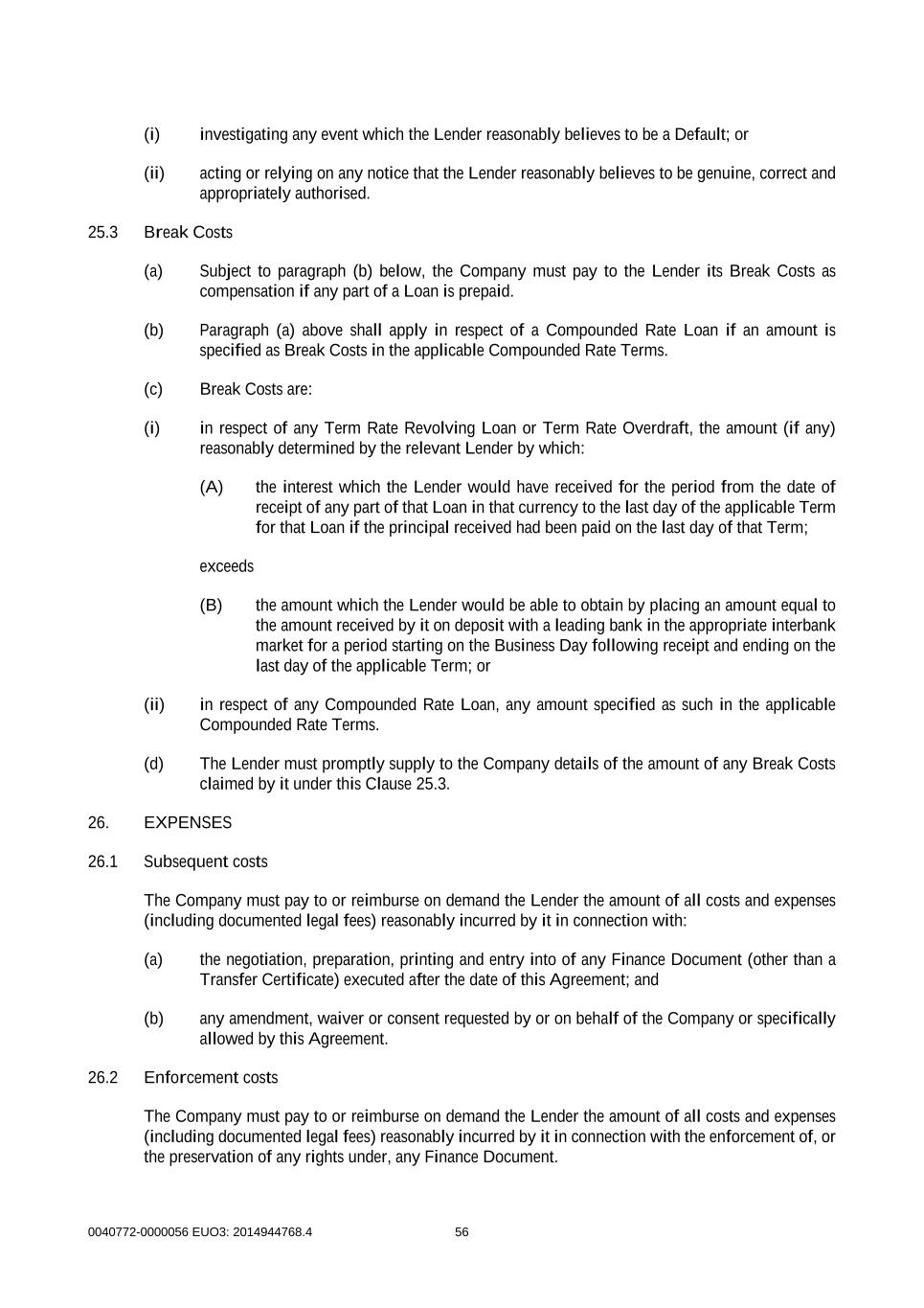 0040772-0000056 EUO3: 2014944768.4 56 (i) investigating any event which the Lender reasonably believes to be a Default; or (ii) acting or relying on any notice that the Lender reasonably believes to be genuine, correct and appropriately authorised. 25.3 Break Costs (a) Subject to paragraph (b) below, the Company must pay to the Lender its Break Costs as compensation if any part of a Loan is prepaid. (b) Paragraph (a) above shall apply in respect of a Compounded Rate Loan if an amount is specified as Break Costs in the applicable Compounded Rate Terms. (c) Break Costs are: (i) in respect of any Term Rate Revolving Loan or Term Rate Overdraft, the amount (if any) reasonably determined by the relevant Lender by which: (A) the interest which the Lender would have received for the period from the date of receipt of any part of that Loan in that currency to the last day of the applicable Term for that Loan if the principal received had been paid on the last day of that Term; exceeds (B) the amount which the Lender would be able to obtain by placing an amount equal to the amount received by it on deposit with a leading bank in the appropriate interbank market for a period starting on the Business Day following receipt and ending on the last day of the applicable Term; or (ii) in respect of any Compounded Rate Loan, any amount specified as such in the applicable Compounded Rate Terms. (d) The Lender must promptly supply to the Company details of the amount of any Break Costs claimed by it under this Clause 25.3. 26. EXPENSES 26.1 Subsequent costs The Company must pay to or reimburse on demand the Lender the amount of all costs and expenses (including documented legal fees) reasonably incurred by it in connection with: (a) the negotiation, preparation, printing and entry into of any Finance Document (other than a Transfer Certificate) executed after the date of this Agreement; and (b) any amendment, waiver or consent requested by or on behalf of the Company or specifically allowed by this Agreement. 26.2 Enforcement costs The Company must pay to or reimburse on demand the Lender the amount of all costs and expenses (including documented legal fees) reasonably incurred by it in connection with the enforcement of, or the preservation of any rights under, any Finance Document.