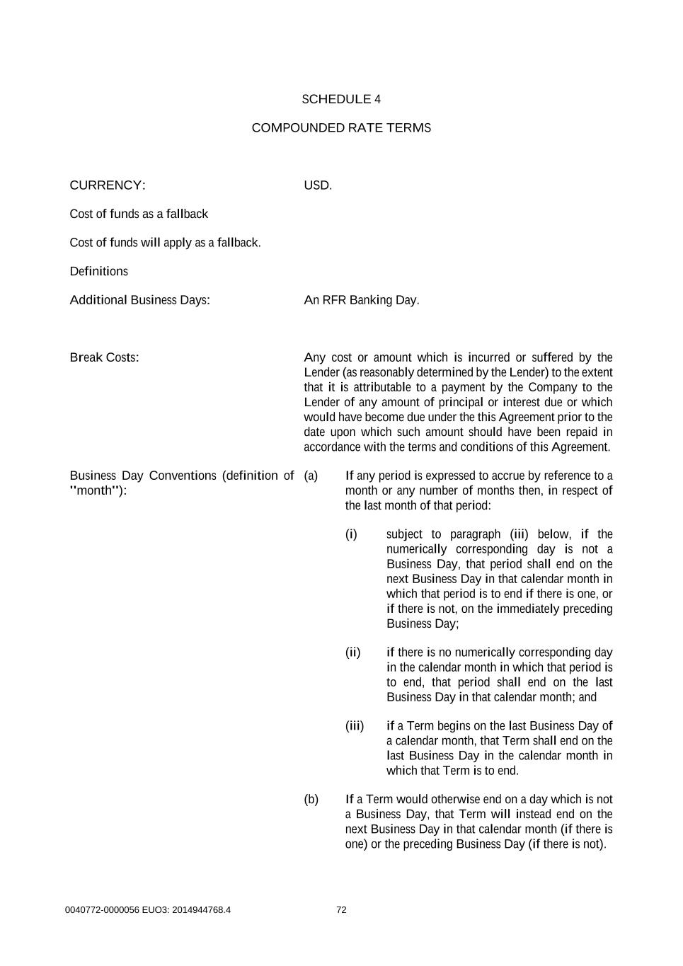 0040772-0000056 EUO3: 2014944768.4 72 SCHEDULE 4 COMPOUNDED RATE TERMS CURRENCY: USD. Cost of funds as a fallback Cost of funds will apply as a fallback. Definitions Additional Business Days: An RFR Banking Day. Break Costs: Any cost or amount which is incurred or suffered by the Lender (as reasonably determined by the Lender) to the extent that it is attributable to a payment by the Company to the Lender of any amount of principal or interest due or which would have become due under the this Agreement prior to the date upon which such amount should have been repaid in accordance with the terms and conditions of this Agreement. Business Day Conventions (definition of "month"): (a) If any period is expressed to accrue by reference to a month or any number of months then, in respect of the last month of that period: (i) subject to paragraph (iii) below, if the numerically corresponding day is not a Business Day, that period shall end on the next Business Day in that calendar month in which that period is to end if there is one, or if there is not, on the immediately preceding Business Day; (ii) if there is no numerically corresponding day in the calendar month in which that period is to end, that period shall end on the last Business Day in that calendar month; and (iii) if a Term begins on the last Business Day of a calendar month, that Term shall end on the last Business Day in the calendar month in which that Term is to end. (b) If a Term would otherwise end on a day which is not a Business Day, that Term will instead end on the next Business Day in that calendar month (if there is one) or the preceding Business Day (if there is not).