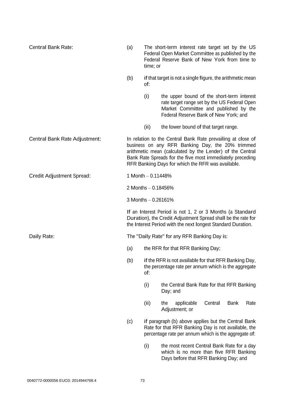 0040772-0000056 EUO3: 2014944768.4 73 Central Bank Rate: (a) The short-term interest rate target set by the US Federal Open Market Committee as published by the Federal Reserve Bank of New York from time to time; or (b) if that target is not a single figure, the arithmetic mean of: (i) the upper bound of the short-term interest rate target range set by the US Federal Open Market Committee and published by the Federal Reserve Bank of New York; and (ii) the lower bound of that target range. Central Bank Rate Adjustment: In relation to the Central Bank Rate prevailing at close of business on any RFR Banking Day, the 20% trimmed arithmetic mean (calculated by the Lender) of the Central Bank Rate Spreads for the five most immediately preceding RFR Banking Days for which the RFR was available. Credit Adjustment Spread: 1 Month – 0.11448% 2 Months – 0.18456% 3 Months – 0.26161% If an Interest Period is not 1, 2 or 3 Months (a Standard Duration), the Credit Adjustment Spread shall be the rate for the Interest Period with the next longest Standard Duration. Daily Rate: The "Daily Rate" for any RFR Banking Day is: (a) the RFR for that RFR Banking Day; (b) if the RFR is not available for that RFR Banking Day, the percentage rate per annum which is the aggregate of: (i) the Central Bank Rate for that RFR Banking Day; and (ii) the applicable Central Bank Rate Adjustment; or (c) if paragraph (b) above applies but the Central Bank Rate for that RFR Banking Day is not available, the percentage rate per annum which is the aggregate of: (i) the most recent Central Bank Rate for a day which is no more than five RFR Banking Days before that RFR Banking Day; and