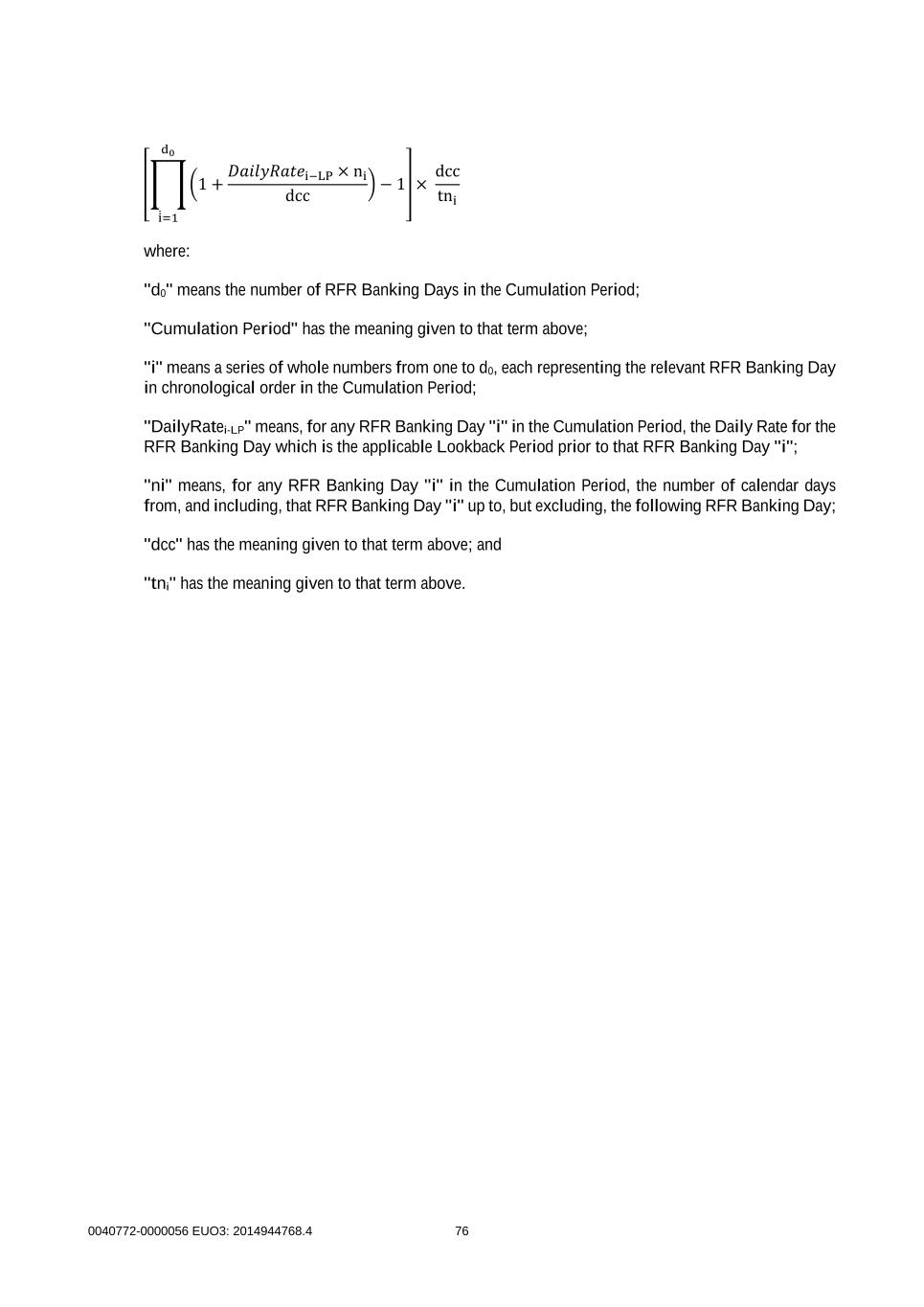 0040772-0000056 EUO3: 2014944768.4 76 [ ∏(1 + 𝐷𝑎𝑖𝑙𝑦𝑅𝑎𝑡𝑒i−LP × ni dcc ) d0 i̇=1 − 1 ] × dcc tni where: "d0" means the number of RFR Banking Days in the Cumulation Period; "Cumulation Period" has the meaning given to that term above; "i" means a series of whole numbers from one to d0, each representing the relevant RFR Banking Day in chronological order in the Cumulation Period; "DailyRatei-LP" means, for any RFR Banking Day "i" in the Cumulation Period, the Daily Rate for the RFR Banking Day which is the applicable Lookback Period prior to that RFR Banking Day "i"; "ni" means, for any RFR Banking Day "i" in the Cumulation Period, the number of calendar days from, and including, that RFR Banking Day "i" up to, but excluding, the following RFR Banking Day; "dcc" has the meaning given to that term above; and "tni" has the meaning given to that term above.