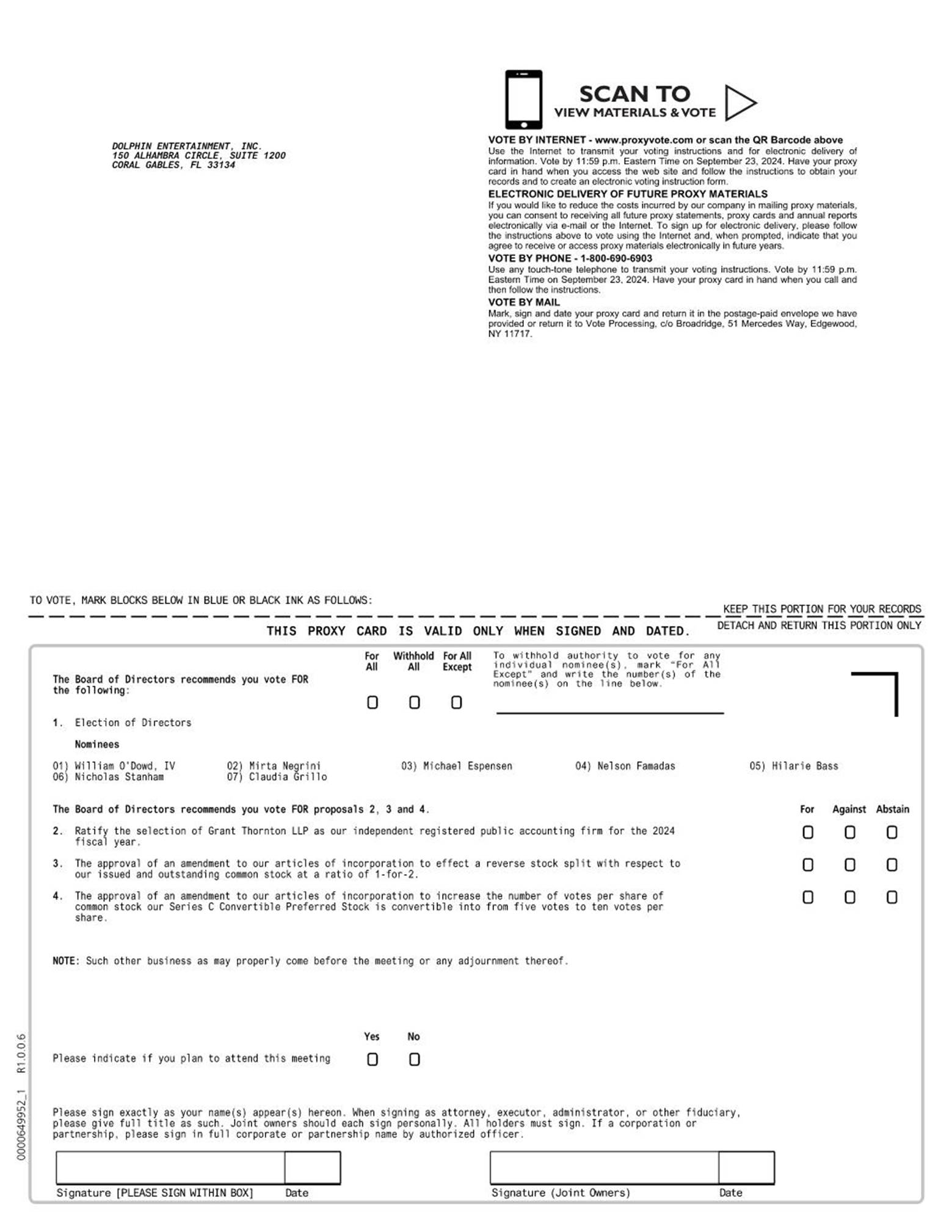 It is my pleasure to invite you to attend the annual meeting of shareholders (the “Annual Meeting”) of Dolphin Entertainment, Inc., a Florida corporation (the “Company”). The Annual Meeting will be held on September 24, 2024 at 10:00 a.m. Eastern Daylight Time at 200 South Biscayne Boulevard, 39th Floor, Miami, Florida 33131.