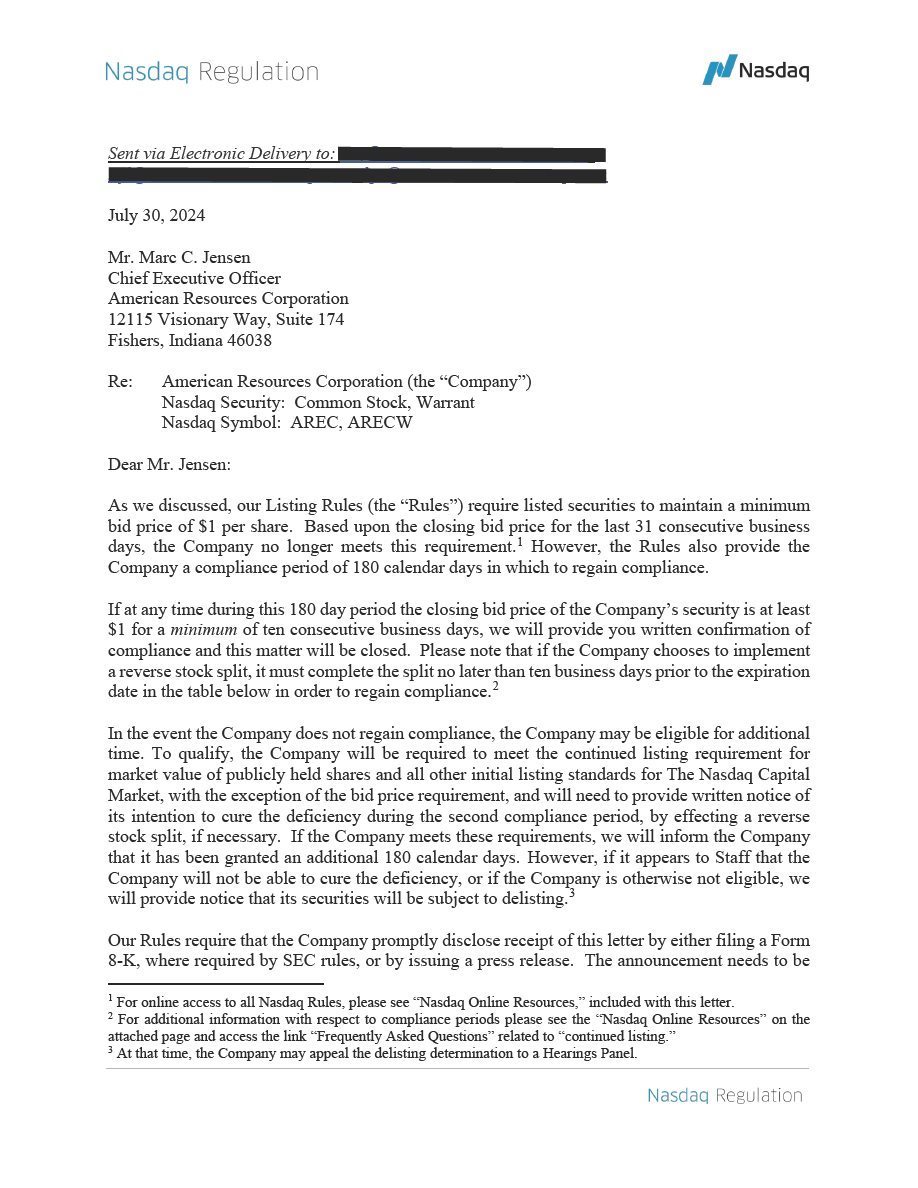 On July 30, 2024, American Resources Corporation (or the “Company”) received a letter from the Nasdaq Stock Market indicating that for 31 consecutive business days the Company’s stock has not maintained a minimum closing bid price of $1.00 per share (“Minimum Bid Price Requirement”) as required by Nasdaq Listing Rule 5550(a)(2).