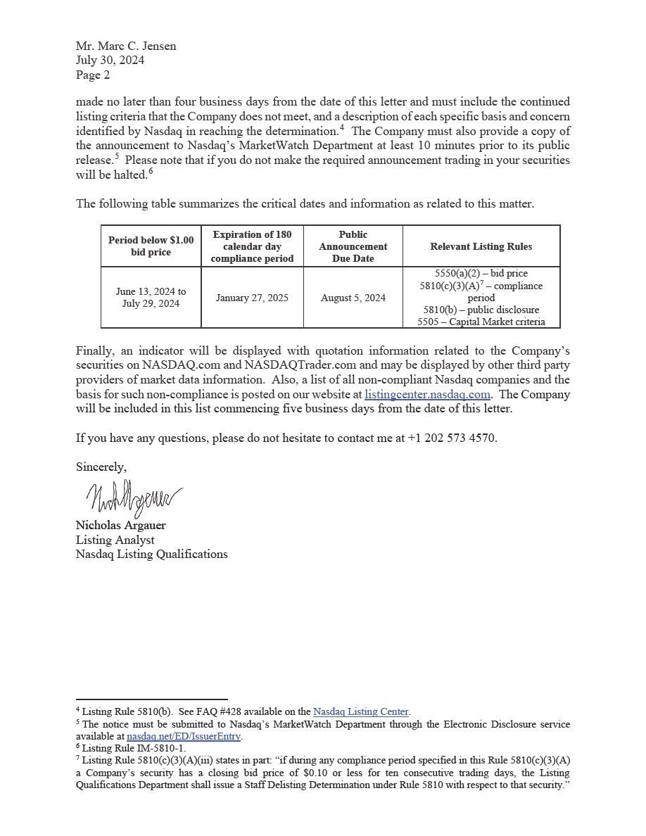 If the Company does not achieve compliance with the Minimum Bid Price Requirement by January 27, 2025, the Company may be eligible for an additional 180 day period to meet the continued listing requirement for market value of publicly held shares and all other initial listing standards for the Nasdaq Capital Market, with the exception of the Minimum Bid Price Requirement, by providing a written notice of its intention to cure the deficiency during the second compliance period. If the Company meets these requirements, an additional 180 days will be granted. If the Company will not be able to cure the deficiency, or if the Company is otherwise not eligible, Nasdaq will provide a notice that the Company’s common stock will be subject to delisting.