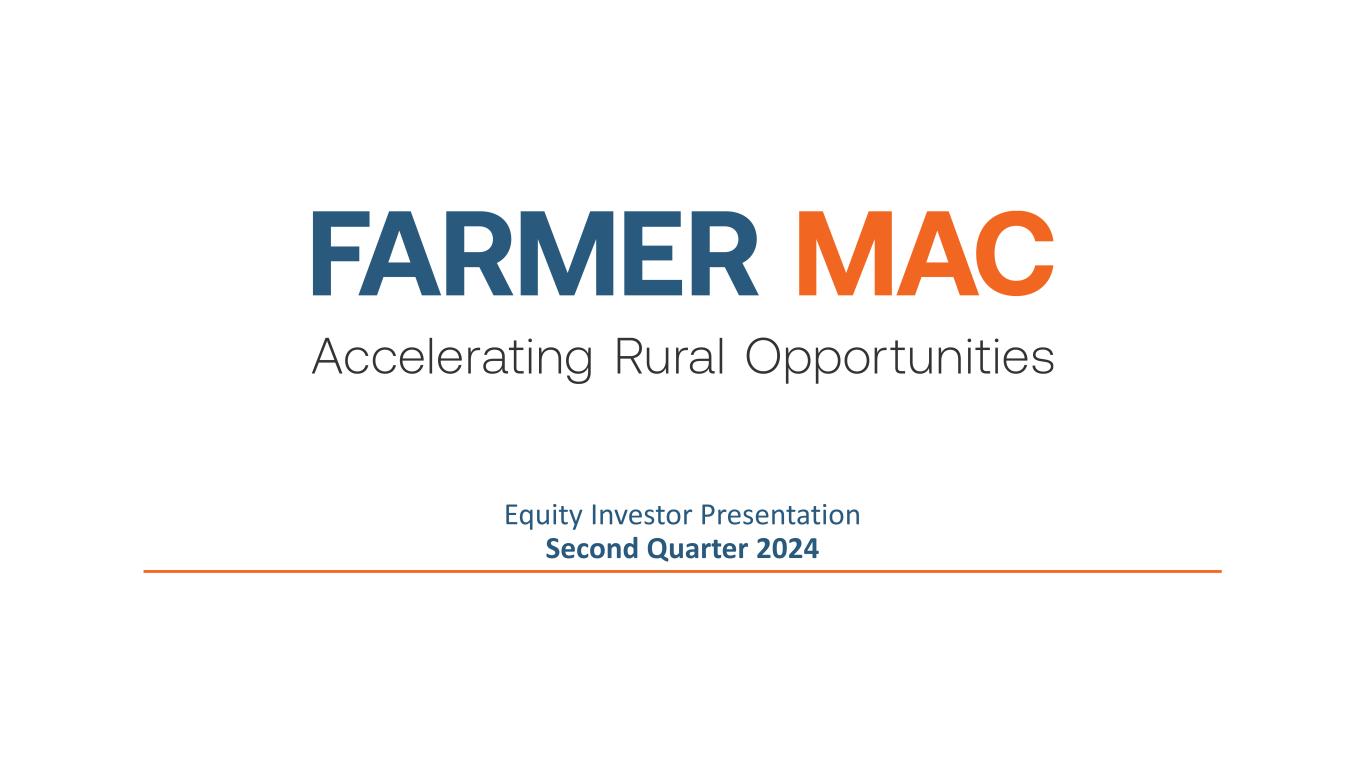 Forward-Looking Statements 2 In addition to historical information, this presentation includes forward-looking statements that reflect management’s current expectations for Farmer Mac’s future financial results, business prospects, and business developments. Forward-looking statements include, without limitation, any statement that may predict, forecast, indicate, or imply future results, performance, or achievements. Management’s expectations for Farmer Mac’s future necessarily involve assumptions, estimates, and the evaluation of risks and uncertainties. Various factors or events, both known and unknown, could cause Farmer Mac’s actual results to differ materially from the expectations as expressed or implied by the forward- looking statements. Some of these factors are identified and discussed in Farmer Mac’s Quarterly Report on Form 10-Q for the quarter ended June 30, 2024, filed with the SEC on August 5, 2024. These reports are also available on Farmer Mac’s website (www.farmermac.com). Considering these potential risks and uncertainties, no undue reliance should be placed on any forward-looking statements expressed in this presentation. Any forward-looking statements made in this presentation are current only as of June 30, 2024, except as otherwise indicated. Farmer Mac undertakes no obligation to release publicly the results of revisions to any such forward-looking statements that may be made to reflect new information or any future events or circumstances, except as otherwise required by applicable law. The information in this presentation is not necessarily indicative of future results. NO OFFER OR SOLICITATION OF SECURITIES This presentation does not constitute an offer to sell or a solicitation of an offer to buy any Farmer Mac security. Farmer Mac securities are offered only in jurisdictions where permissible by offering documents available through qualified securities dealers. Any investor who is considering purchasing a Farmer Mac security should consult the applicable offering documents for the security and their own financial and legal advisors for information about and analysis of the security, the risks associated with the security, and the suitability of the investment for the investor’s particular circumstances. Copyright © 2024 by Farmer Mac. No part of this document may be duplicated, reproduced, distributed, or displayed in public in any manner or by any means without the written permission of Farmer Mac.