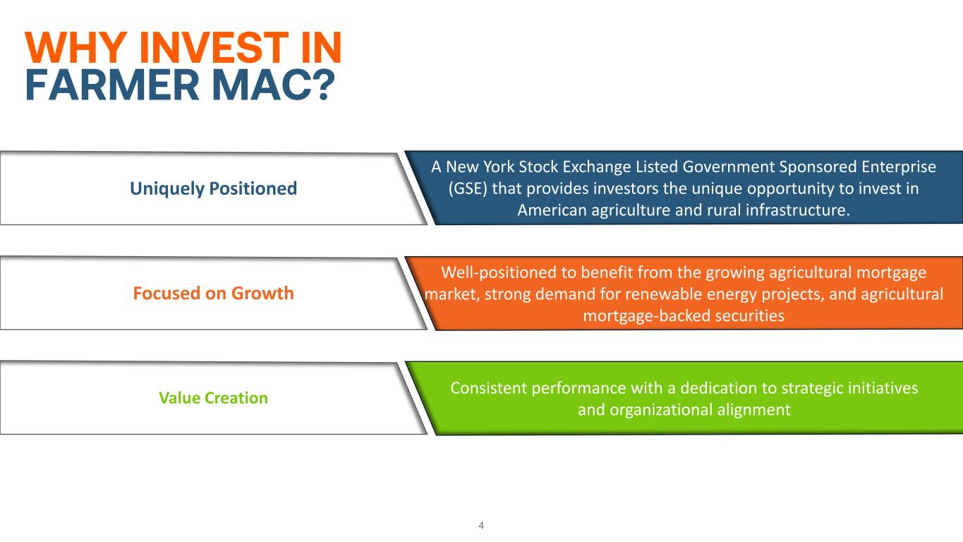 Use of Non-GAAP Financial Measures 3 This presentation is for general informational purposes only, is current only as of June 30, 2024 and should be read in conjunction with Farmer Mac’s Quarterly Report on Form 10-Q filed with the SEC on August 5, 2024. In the accompanying analysis of its financial information, Farmer Mac uses the following non-GAAP financial measures: core earnings, core earnings per share, and net effective spread. Farmer Mac uses these non-GAAP measures to measure corporate economic performance and develop financial plans because, in management's view, they are useful alternative measures in understanding Farmer Mac's economic performance, transaction economics, and business trends. The non-GAAP financial measures that Farmer Mac uses may not be comparable to similarly labeled non-GAAP financial measures disclosed by other companies. Farmer Mac's disclosure of these non-GAAP financial measures is intended to be supplemental in nature and is not meant to be considered in isolation from, as a substitute for, or as more important than, the related financial information prepared in accordance with GAAP. Core earnings and core earnings per share principally differ from net income attributable to common stockholders and earnings per common share, respectively, by excluding the effects of fair value fluctuations. These fluctuations are not expected to have a cumulative net impact on Farmer Mac's financial condition or results of operations reported in accordance with GAAP if the related financial instruments are held to maturity, as is expected. Core earnings and core earnings per share also differ from net income attributable to common stockholders and earnings per common share, respectively, by excluding specified infrequent or unusual transactions that Farmer Mac believes are not indicative of future operating results and that may not reflect the trends and economic financial performance of Farmer Mac's core business. Farmer Mac uses net effective spread to measure the net spread Farmer Mac earns between its interest-earning assets and the related net funding costs of these assets. Net effective spread differs from net interest income and net interest yield because it excludes: (1) the interest income and interest expense associated with the consolidated trusts and the average balance of the loans underlying these trusts; and (2) the fair value changes of financial derivatives and the corresponding assets or liabilities designated in fair value hedge accounting relationships. Net effective spread also principally differs from net interest income and net interest yield because it includes the accrual of income and expense related to the contractual amounts due on financial derivatives that are not designated in hedge accounting relationships ("undesignated financial derivatives") and the net effects of terminations or net settlements on financial derivatives, which consist of: (1) the net effects of cash settlements on agency forward contracts on the debt of other GSEs and U.S. Treasury security futures that we use as short-term economic hedges on the issuance of debt; and (2) the net effects of initial cash payments that Farmer Mac receives upon the inception of certain swaps.