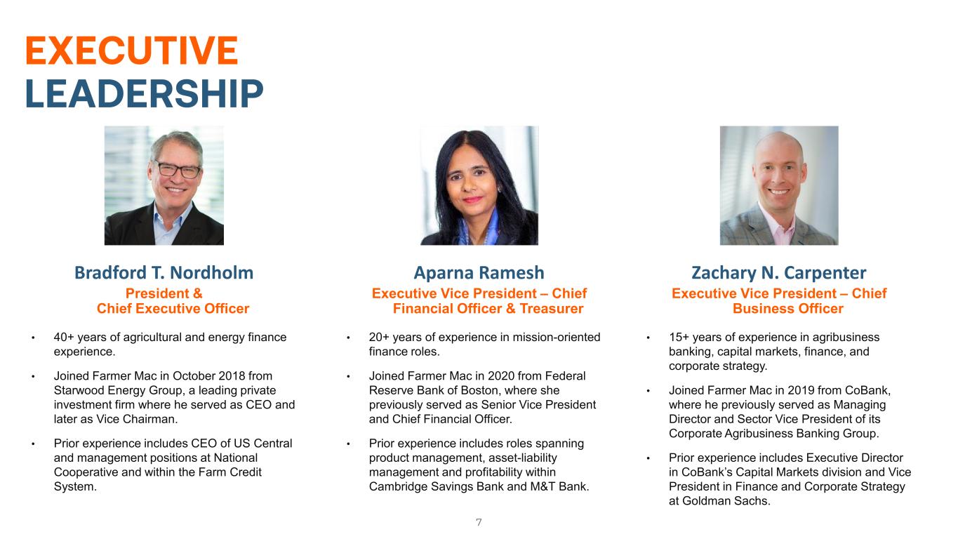 A MISSION-DRIVEN, FOR-PROFIT COMPANY 6 TODAY1999 Listed on NYSE (Ticker: AGM) 1990 First expansion of authority: USDA guaranteed securities 1988 Farmer Mac initially chartered as an instrumentality of the United States 1996 Second expansion of authority: direct loan purchases 2008 Third expansion of authority: rural utilities loans With outstanding business volume of nearly $30 billion, Farmer Mac remains resolute in its commitment to growth, innovation, and mission fulfillment