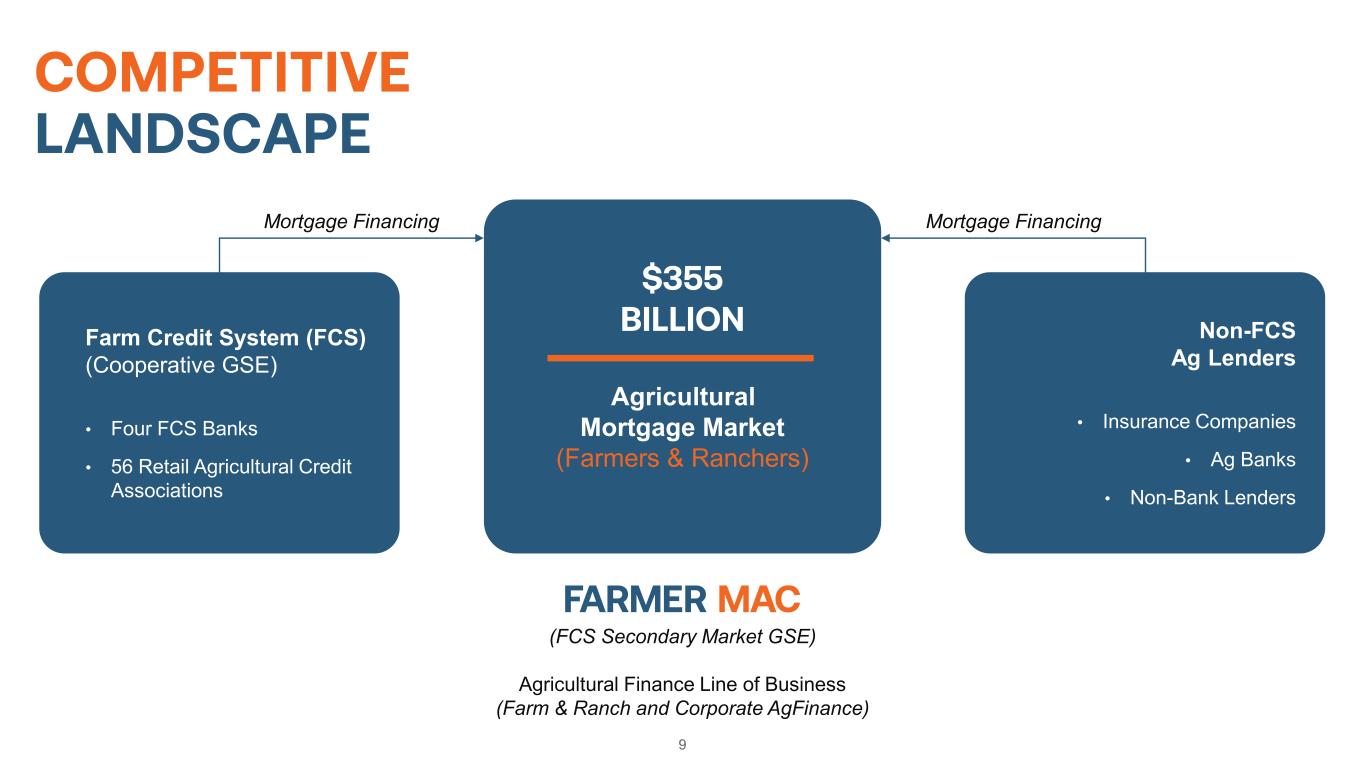 CENTRAL TO A LARGE AGRICULTURAL MORTGAGE MARKET 8 Investments, $118,004,577 Inventories, $190,135,224 Real Estate $3,419,530,718 Machinery & Vehicles, $362,280,165 $4,089,950,684 Real Estate, $355,040,830 Nonreal Estate, $165,587,534 $520,628,364 $0 $500,000,000 $1,000,000,000 $1,500,000,000 $2,000,000,000 $2,500,000,000 $3,000,000,000 $3,500,000,000 $4,000,000,000 Farm Sector Assets 2023F Farm Sector Debt 2023F $ IN T H O U SA N D S Ag Real Estate Debt-to-Asset Ratio: 10.4% (1)