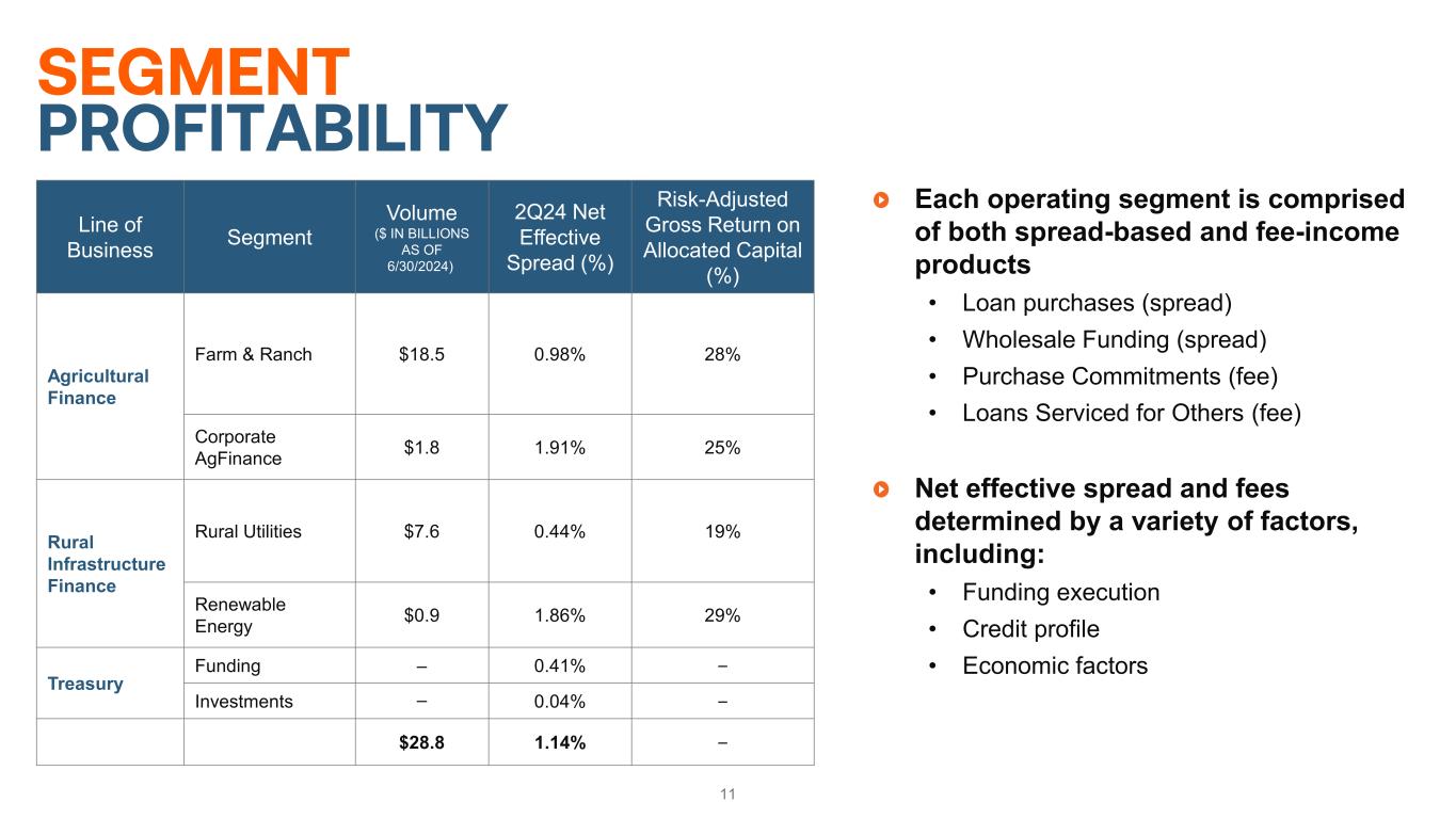 10 FARMER MAC’S OPERATING MODEL Operating model excludes issued agricultural mortgage-backed securities and long-term standby purchase commitment credit protection components of our business. Farmer Mac’s Regulatory/Congressional Oversight • Regulated by the Farm Credit Administration (FCA) through its Office of Secondary Market Oversight (OSMO) • Congressional oversight through Senate and House Agricultural Committees