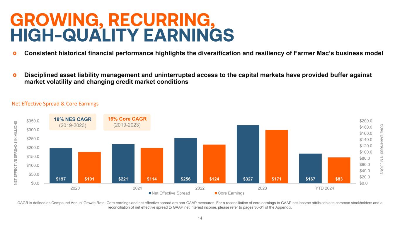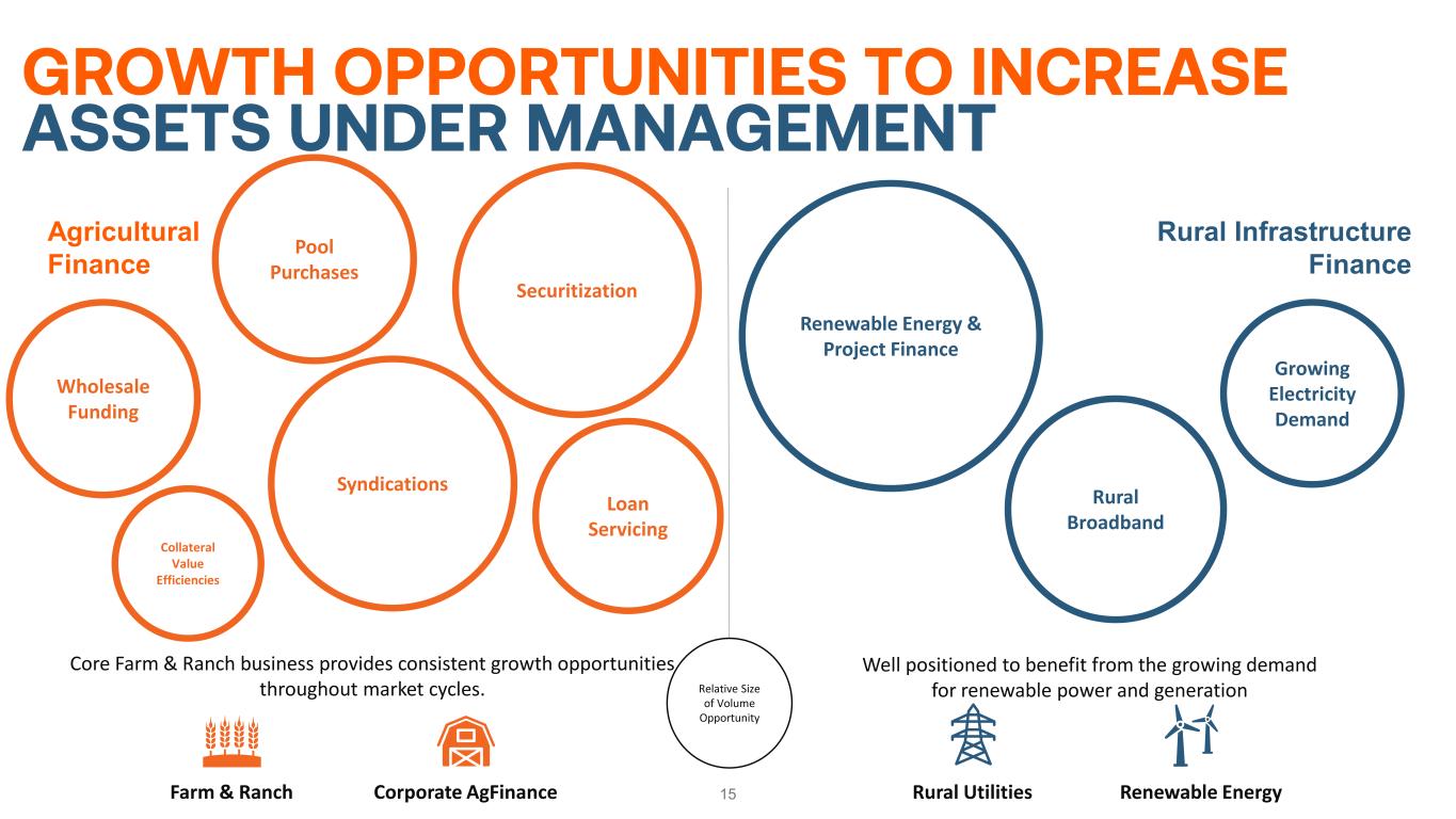 $197 $221 $256 $327 $167$101 $114 $124 $171 $83 $0.0 $20.0 $40.0 $60.0 $80.0 $100.0 $120.0 $140.0 $160.0 $180.0 $200.0 $0.0 $50.0 $100.0 $150.0 $200.0 $250.0 $300.0 $350.0 2020 2021 2022 2023 YTD 2024 C O R E EAR N IN G S$ IN M ILLIO N S N ET E FF EC TI VE S PR EA D $ IN M IL LI O N S Net Effective Spread & Core Earnings Net Effective Spread Core Earnings Consistent historical financial performance highlights the diversification and resiliency of Farmer Mac’s business model Disciplined asset liability management and uninterrupted access to the capital markets have provided buffer against market volatility and changing credit market conditions 14 GROWING, RECURRING, HIGH-QUALITY EARNINGS CAGR is defined as Compound Annual Growth Rate. Core earnings and net effective spread are non-GAAP measures. For a reconciliation of core earnings to GAAP net income attributable to common stockholders and a reconciliation of net effective spread to GAAP net interest income, please refer to pages 30-31 of the Appendix. 18% NES CAGR (2019-2023) 16% Core CAGR (2019-2023)