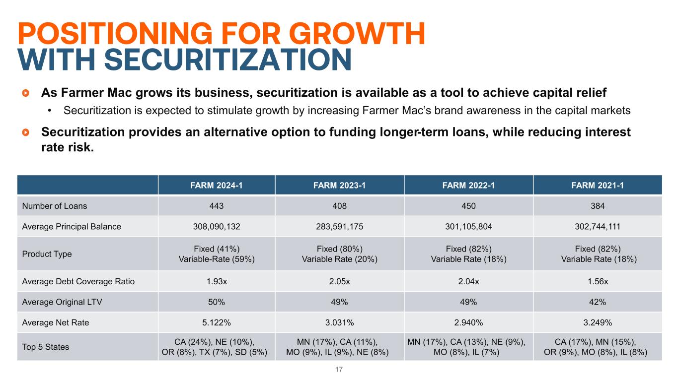 FARM securitization program exemplifies Farmer Mac’s core mission to lower costs for the end borrower and improve credit availability in rural America, while transforming the agricultural mortgage market industry with new efficiencies Building upon the existing FARM Securitization Program by creating a securitization product for our customers • Utilize the current capability to originate new types of eligible loans into a conduit that de-risks the sector • Creates new financing for borrowers and expands sources of revenue for Farmer Mac 16 AGRICULTURAL MORTGAGE-BACKED SECURITIES OPPORTUNITY Farmers & Ranchers Originators Farmer Mac (Mortgage Loan Seller & Guarantor) FARM Program Mortgage Trust (Securitization Issuing Entity) Senior Guaranteed (A) Tranche Subordinated Unguaranteed (B) Tranche