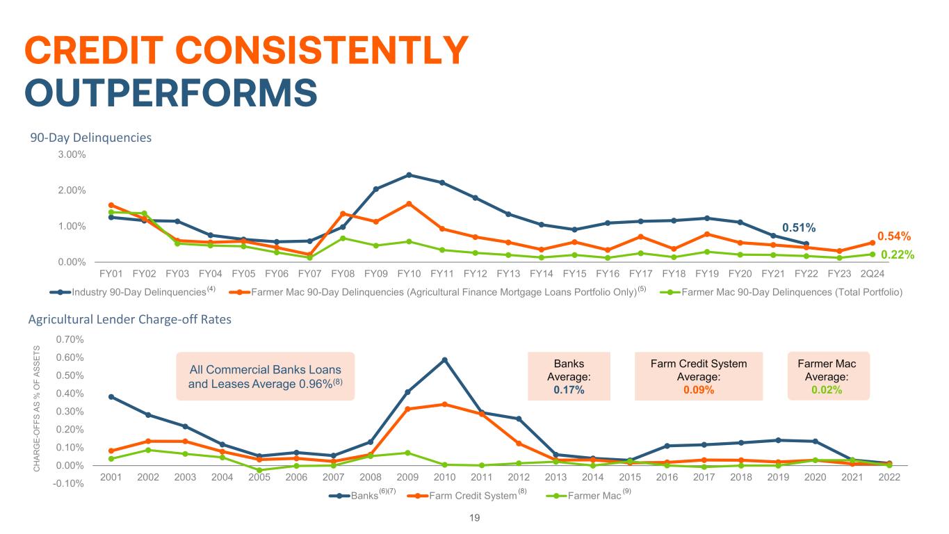 18 FARMER MAC USES PROVEN, RIGOROUS UNDERWRITING Industry-leading credit requirements • Total debt coverage ratio of at least 1.25x • LTVs average 40% to 45% on mortgages purchased • Minimum borrower net equity of 50% Credits are less likely to default • Focus on repayment capacity through stressed inputs • Not a “lender of last resort” • Farm Credit Administration is our safety and soundness regulator Losses less likely even in default • Average portfolio LTV of 46% as of June 30, 2024 • Land values need to decline >55% to generate material losses across Agricultural Finance mortgage loans portfolio • “Stress scenario” losses of 17% to 48% • 1980s crisis saw land value declines of ~23%(3)