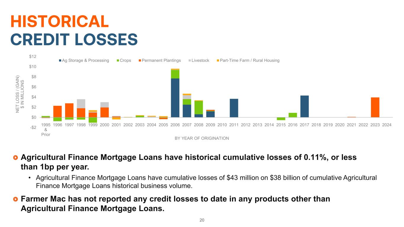 -0.10% 0.00% 0.10% 0.20% 0.30% 0.40% 0.50% 0.60% 0.70% 2001 2002 2003 2004 2005 2006 2007 2008 2009 2010 2011 2012 2013 2014 2015 2016 2017 2018 2019 2020 2021 2022 C H AR G E- O FF S AS % O F AS SE TS Agricultural Lender Charge-off Rates Banks Farm Credit System Farmer Mac 19 CREDIT CONSISTENTLY OUTPERFORMS 0.51% 0.54% 0.22%0.00% 1.00% 2.00% 3.00% FY01 FY02 FY03 FY04 FY05 FY06 FY07 FY08 FY09 FY10 FY11 FY12 FY13 FY14 FY15 FY16 FY17 FY18 FY19 FY20 FY21 FY22 FY23 2Q24 90-Day Delinquencies Industry 90-Day Delinquencies Farmer Mac 90-Day Delinquencies (Agricultural Finance Mortgage Loans Portfolio Only) Farmer Mac 90-Day Delinquences (Total Portfolio) All Commercial Banks Loans and Leases Average 0.96%(8) Banks Average: 0.17% Farm Credit System Average: 0.09% Farmer Mac Average: 0.02% (4) (5) (6)(7) (8) (9)