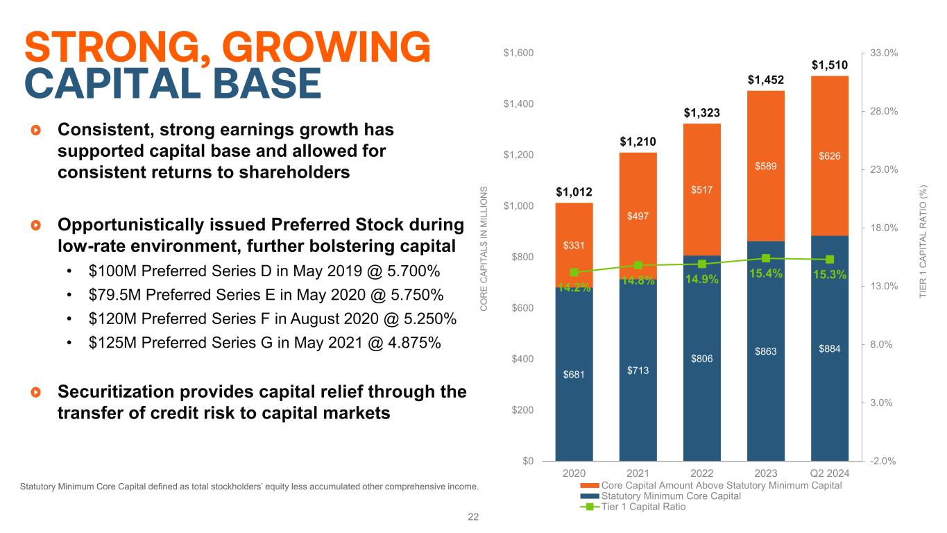 Consistent, strong earnings growth has supported capital base and allowed for consistent returns to shareholders Opportunistically issued Preferred Stock during low-rate environment, further bolstering capital • $100M Preferred Series D in May 2019 @ 5.700% • $79.5M Preferred Series E in May 2020 @ 5.750% • $120M Preferred Series F in August 2020 @ 5.250% • $125M Preferred Series G in May 2021 @ 4.875% Securitization provides capital relief through the transfer of credit risk to capital markets 22 STRONG, GROWING CAPITAL BASE Statutory Minimum Core Capital defined as total stockholders’ equity less accumulated other comprehensive income. $681 $713 $806 $863 $884 $331 $497 $517 $589 $626 $1,012 $1,210 $1,323 $1,452 $1,510 14.2% 14.8% 14.9% 15.4% 15.3% -2.0% 3.0% 8.0% 13.0% 18.0% 23.0% 28.0% 33.0% $0 $200 $400 $600 $800 $1,000 $1,200 $1,400 $1,600 2020 2021 2022 2023 Q2 2024 TI ER 1 C AP IT AL R AT IO (% ) C O R E C AP IT AL $ IN M IL LI O N S Core Capital Amount Above Statutory Minimum Capital Statutory Minimum Core Capital Tier 1 Capital Ratio
