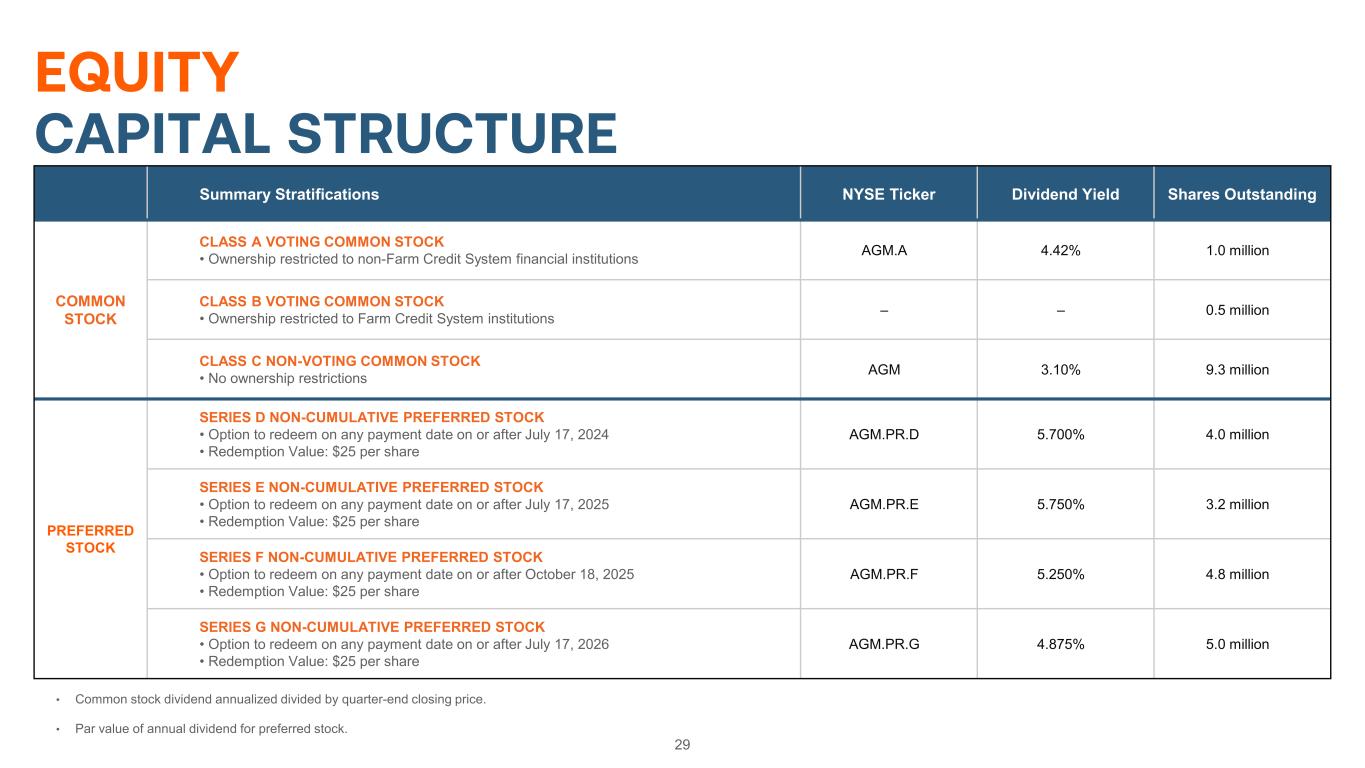 29 EQUITY CAPITAL STRUCTURE • Common stock dividend annualized divided by quarter-end closing price. • Par value of annual dividend for preferred stock. Summary Stratifications NYSE Ticker Dividend Yield Shares Outstanding COMMON STOCK CLASS A VOTING COMMON STOCK • Ownership restricted to non-Farm Credit System financial institutions AGM.A 4.42% 1.0 million CLASS B VOTING COMMON STOCK • Ownership restricted to Farm Credit System institutions – – 0.5 million CLASS C NON-VOTING COMMON STOCK • No ownership restrictions AGM 3.10% 9.3 million PREFERRED STOCK SERIES D NON-CUMULATIVE PREFERRED STOCK • Option to redeem on any payment date on or after July 17, 2024 • Redemption Value: $25 per share AGM.PR.D 5.700% 4.0 million SERIES E NON-CUMULATIVE PREFERRED STOCK • Option to redeem on any payment date on or after July 17, 2025 • Redemption Value: $25 per share AGM.PR.E 5.750% 3.2 million SERIES F NON-CUMULATIVE PREFERRED STOCK • Option to redeem on any payment date on or after October 18, 2025 • Redemption Value: $25 per share AGM.PR.F 5.250% 4.8 million SERIES G NON-CUMULATIVE PREFERRED STOCK • Option to redeem on any payment date on or after July 17, 2026 • Redemption Value: $25 per share AGM.PR.G 4.875% 5.0 million