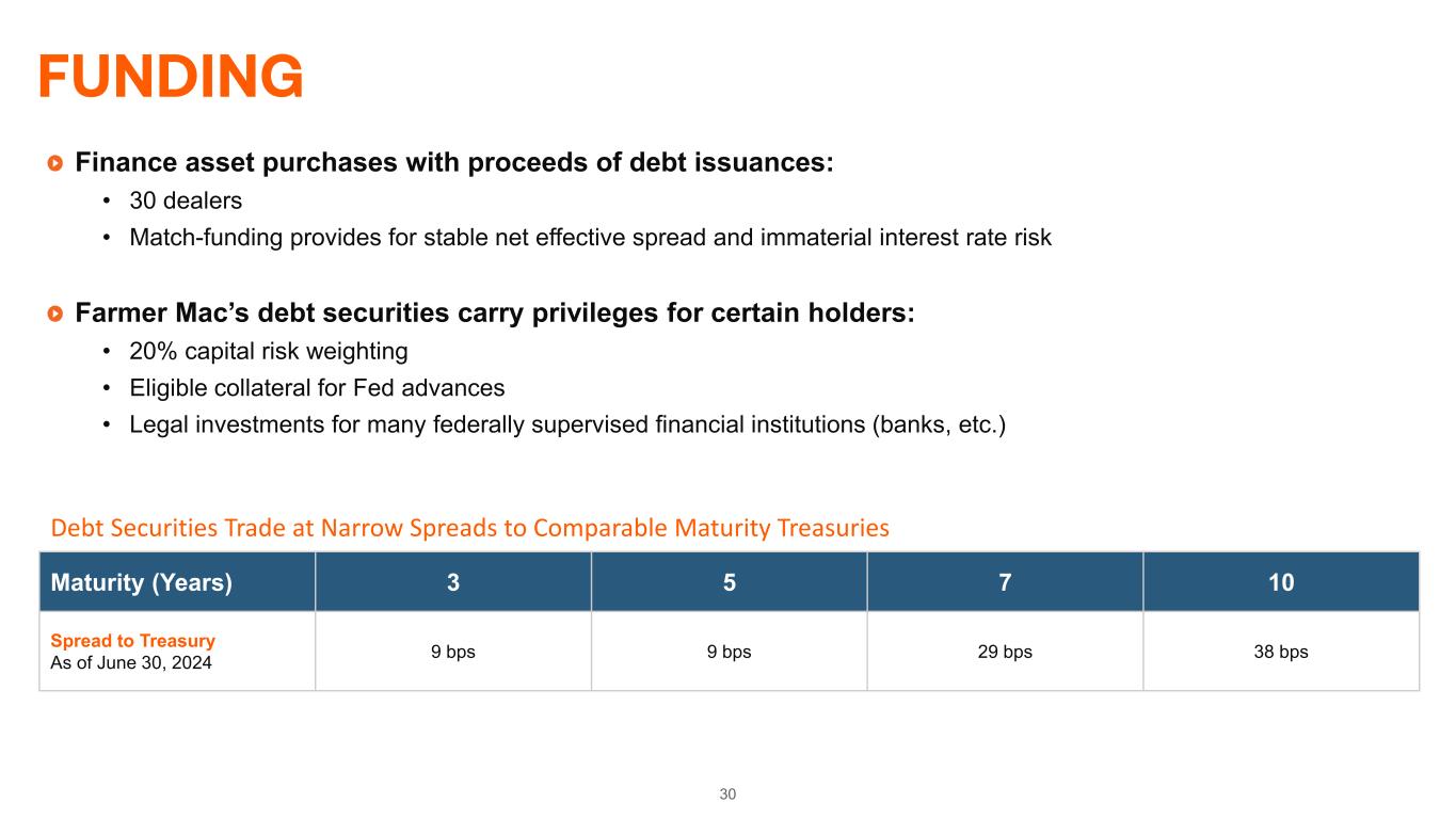 30 FUNDING Finance asset purchases with proceeds of debt issuances: • 30 dealers • Match-funding provides for stable net effective spread and immaterial interest rate risk Farmer Mac’s debt securities carry privileges for certain holders: • 20% capital risk weighting • Eligible collateral for Fed advances • Legal investments for many federally supervised financial institutions (banks, etc.) Debt Securities Trade at Narrow Spreads to Comparable Maturity Treasuries Maturity (Years) 3 5 7 10 Spread to Treasury As of June 30, 2024 9 bps 9 bps 29 bps 38 bps