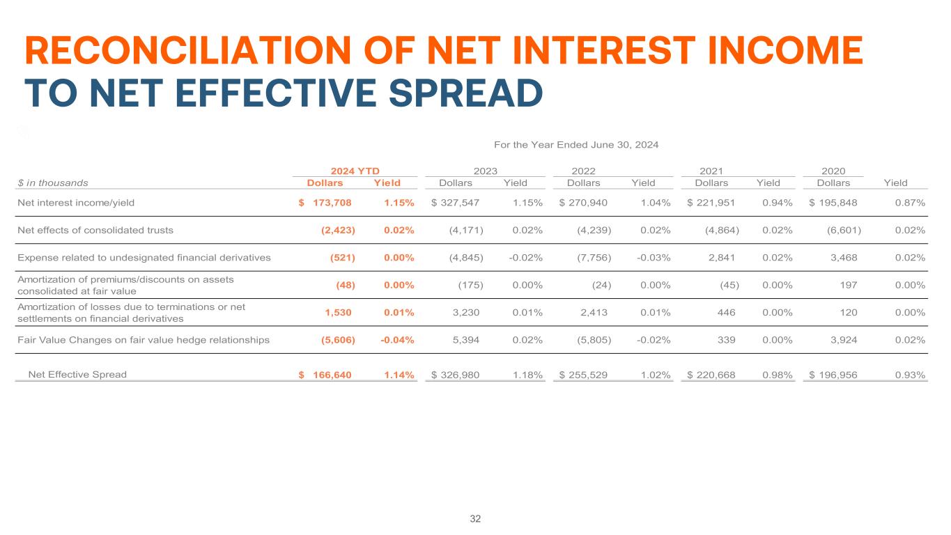 31 RECONCILIATION OF NET INCOME TO CORE EARNINGS (in thousands) 2024 YTD 2023 2022 2021 2020 Net income attributable to common stockholders 87,268$ 172,838$ 150,979$ 111,413$ 94,904$ Less reconciling items: (Losses)/gains on undesignated financial derivatives due to fair value changes 1,324 5,142 13,495 (1,430) (1,701) (Losses)/gains on hedging activities due to fair value changes 5,606 (5,394) 5,343 (1,809) (4,759) (Losses)/gains on trading assets (101) 1,979 (917) (115) 51 Net effects of amortization of premiums/discounts and deferred gains on assets consolidated at fair value 57 175 39 130 58 Net effects of terminations or net settlements on financial derivatives (1,697) 227 15,794 494 1,236 Issuance costs on retirement of preferred stock - - - - (1,667) Income tax effect related to reconciling items (1,090) (447) (7,089) 573 1,074 Sub-total 4,099 1,682 26,665 (2,157) (5,708) Core earnings 83,169$ 171,156$ 124,314$ 113,570$ 100,612$ Core Earnings by Period Ended Issuance costs on retirement of preferred stock relates to the write-off of deferred issuance costs as a result of the retirement of Series A Preferred Stock and Series B Preferred Stock.