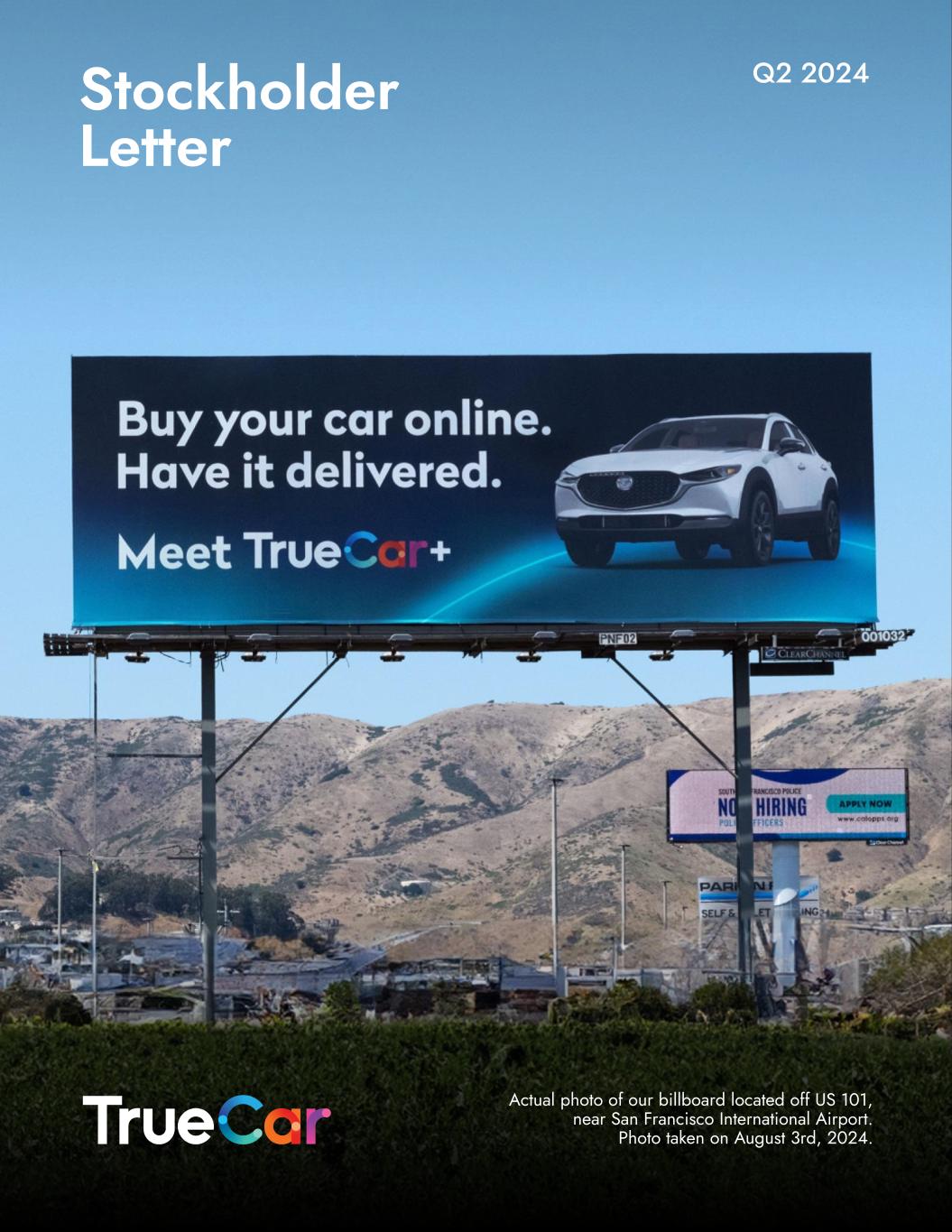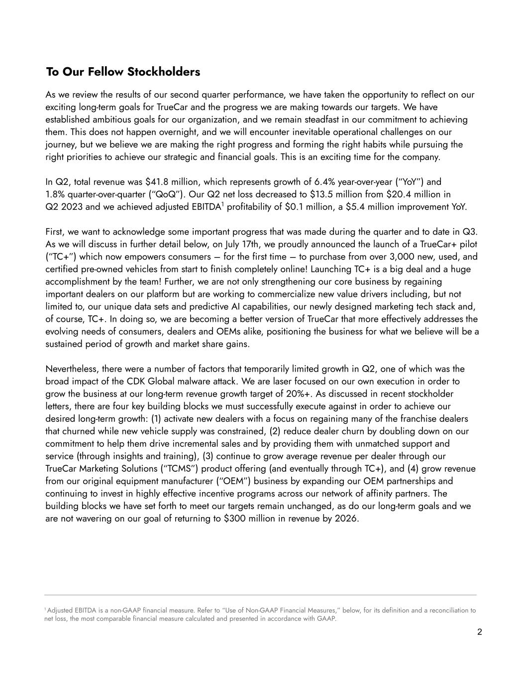 To Our Fellow Stockholders As we review the results of our second quarter performance, we have taken the opportunity to reflect on our exciting long-term goals for TrueCar and the progress we are making towards our targets. We have established ambitious goals for our organization, and we remain steadfast in our commitment to achieving them. This does not happen overnight, and we will encounter inevitable operational challenges on our journey, but we believe we are making the right progress and forming the right habits while pursuing the right priorities to achieve our strategic and financial goals. This is an exciting time for the company. In Q2, total revenue was $41.8 million, which represents growth of 6.4% year-over-year (“YoY”) and 1.8% quarter-over-quarter (“QoQ”). Our Q2 net loss decreased to $13.5 million from $20.4 million in Q2 2023 and we achieved adjusted EBITDA1 profitability of $0.1 million, a $5.4 million improvement YoY. First, we want to acknowledge some important progress that was made during the quarter and to date in Q3. As we will discuss in further detail below, on July 17th, we proudly announced the launch of a TrueCar+ pilot (“TC+”) which now empowers consumers – for the first time – to purchase from over 3,000 new, used, and certified pre-owned vehicles from start to finish completely online! Launching TC+ is a big deal and a huge accomplishment by the team! Further, we are not only strengthening our core business by regaining important dealers on our platform but are working to commercialize new value drivers including, but not limited to, our unique data sets and predictive AI capabilities, our newly designed marketing tech stack and, of course, TC+. In doing so, we are becoming a better version of TrueCar that more effectively addresses the evolving needs of consumers, dealers and OEMs alike, positioning the business for what we believe will be a sustained period of growth and market share gains. Nevertheless, there were a number of factors that temporarily limited growth in Q2, one of which was the broad impact of the CDK Global malware attack. We are laser focused on our own execution in order to grow the business at our long-term revenue growth target of 20%+. As discussed in recent stockholder letters, there are four key building blocks we must successfully execute against in order to achieve our desired long-term growth: (1) activate new dealers with a focus on regaining many of the franchise dealers that churned while new vehicle supply was constrained, (2) reduce dealer churn by doubling down on our commitment to help them drive incremental sales and by providing them with unmatched support and service (through insights and training), (3) continue to grow average revenue per dealer through our TrueCar Marketing Solutions (“TCMS”) product offering (and eventually through TC+), and (4) grow revenue from our original equipment manufacturer (“OEM”) business by expanding our OEM partnerships and continuing to invest in highly effective incentive programs across our network of affinity partners. The building blocks we have set forth to meet our targets remain unchanged, as do our long-term goals and we are not wavering on our goal of returning to $300 million in revenue by 2026. 2 1 Adjusted EBITDA is a non-GAAP financial measure. Refer to “Use of Non-GAAP Financial Measures,” below, for its definition and a reconciliation to net loss, the most comparable financial measure calculated and presented in accordance with GAAP.