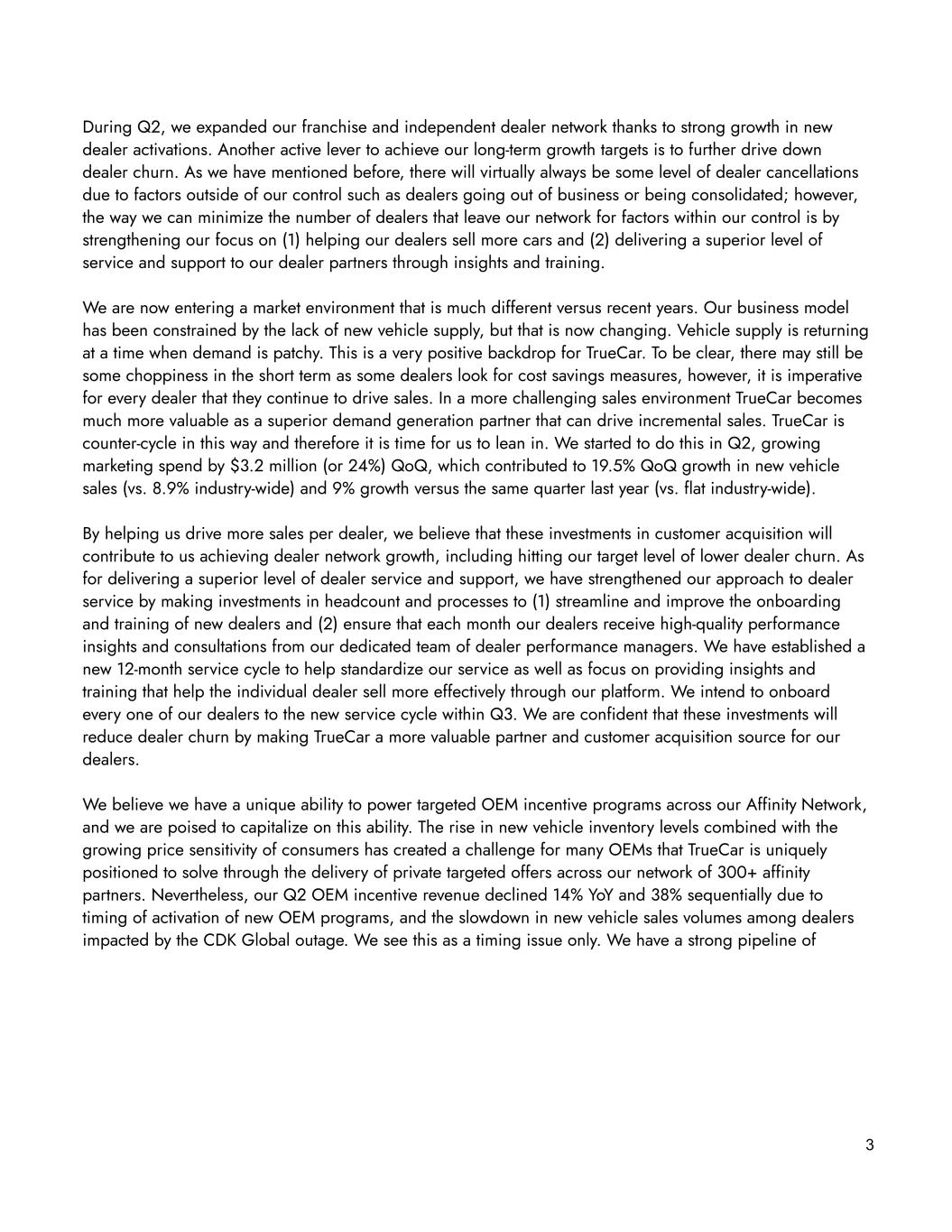 During Q2, we expanded our franchise and independent dealer network thanks to strong growth in new dealer activations. Another active lever to achieve our long-term growth targets is to further drive down dealer churn. As we have mentioned before, there will virtually always be some level of dealer cancellations due to factors outside of our control such as dealers going out of business or being consolidated; however, the way we can minimize the number of dealers that leave our network for factors within our control is by strengthening our focus on (1) helping our dealers sell more cars and (2) delivering a superior level of service and support to our dealer partners through insights and training. We are now entering a market environment that is much different versus recent years. Our business model has been constrained by the lack of new vehicle supply, but that is now changing. Vehicle supply is returning at a time when demand is patchy. This is a very positive backdrop for TrueCar. To be clear, there may still be some choppiness in the short term as some dealers look for cost savings measures, however, it is imperative for every dealer that they continue to drive sales. In a more challenging sales environment TrueCar becomes much more valuable as a superior demand generation partner that can drive incremental sales. TrueCar is counter-cycle in this way and therefore it is time for us to lean in. We started to do this in Q2, growing marketing spend by $3.2 million (or 24%) QoQ, which contributed to 19.5% QoQ growth in new vehicle sales (vs. 8.9% industry-wide) and 9% growth versus the same quarter last year (vs. flat industry-wide). By helping us drive more sales per dealer, we believe that these investments in customer acquisition will contribute to us achieving dealer network growth, including hitting our target level of lower dealer churn. As for delivering a superior level of dealer service and support, we have strengthened our approach to dealer service by making investments in headcount and processes to (1) streamline and improve the onboarding and training of new dealers and (2) ensure that each month our dealers receive high-quality performance insights and consultations from our dedicated team of dealer performance managers. We have established a new 12-month service cycle to help standardize our service as well as focus on providing insights and training that help the individual dealer sell more effectively through our platform. We intend to onboard every one of our dealers to the new service cycle within Q3. We are confident that these investments will reduce dealer churn by making TrueCar a more valuable partner and customer acquisition source for our dealers. We believe we have a unique ability to power targeted OEM incentive programs across our Affinity Network, and we are poised to capitalize on this ability. The rise in new vehicle inventory levels combined with the growing price sensitivity of consumers has created a challenge for many OEMs that TrueCar is uniquely positioned to solve through the delivery of private targeted offers across our network of 300+ affinity partners. Nevertheless, our Q2 OEM incentive revenue declined 14% YoY and 38% sequentially due to timing of activation of new OEM programs, and the slowdown in new vehicle sales volumes among dealers impacted by the CDK Global outage. We see this as a timing issue only. We have a strong pipeline of 3