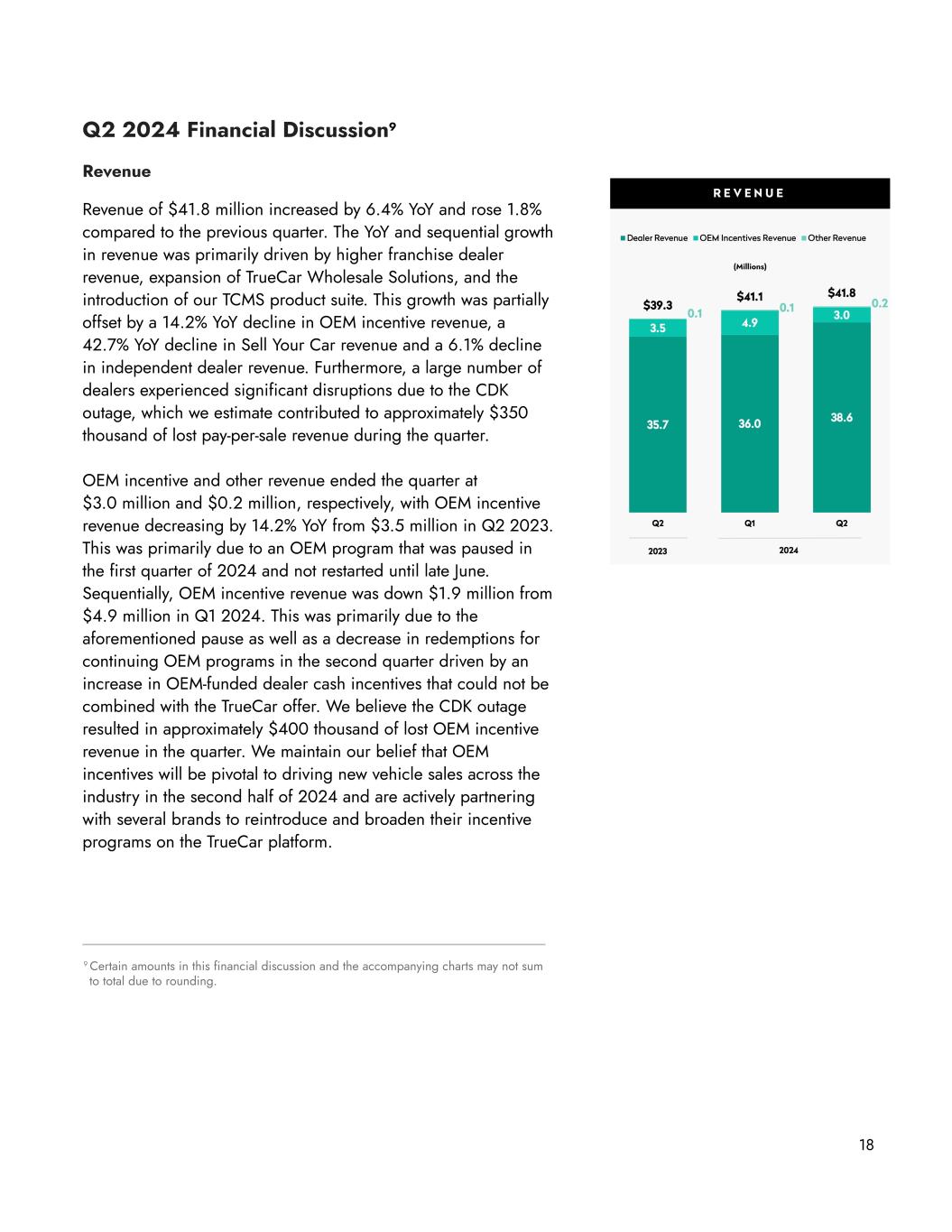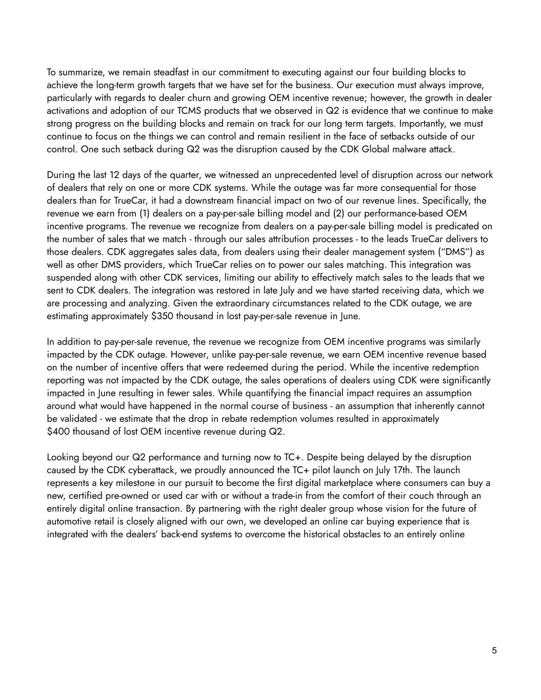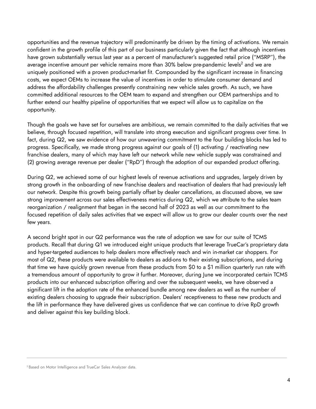 opportunities and the revenue trajectory will predominantly be driven by the timing of activations. We remain confident in the growth profile of this part of our business particularly given the fact that although incentives have grown substantially versus last year as a percent of manufacturer’s suggested retail price (“MSRP”), the average incentive amount per vehicle remains more than 30% below pre-pandemic levels2 and we are uniquely positioned with a proven product-market fit. Compounded by the significant increase in financing costs, we expect OEMs to increase the value of incentives in order to stimulate consumer demand and address the affordability challenges presently constraining new vehicle sales growth. As such, we have committed additional resources to the OEM team to expand and strengthen our OEM partnerships and to further extend our healthy pipeline of opportunities that we expect will allow us to capitalize on the opportunity. Though the goals we have set for ourselves are ambitious, we remain committed to the daily activities that we believe, through focused repetition, will translate into strong execution and significant progress over time. In fact, during Q2, we saw evidence of how our unwavering commitment to the four building blocks has led to progress. Specifically, we made strong progress against our goals of (1) activating / reactivating new franchise dealers, many of which may have left our network while new vehicle supply was constrained and (2) growing average revenue per dealer (“RpD”) through the adoption of our expanded product offering. During Q2, we achieved some of our highest levels of revenue activations and upgrades, largely driven by strong growth in the onboarding of new franchise dealers and reactivation of dealers that had previously left our network. Despite this growth being partially offset by dealer cancellations, as discussed above, we saw strong improvement across our sales effectiveness metrics during Q2, which we attribute to the sales team reorganization / realignment that began in the second half of 2023 as well as our commitment to the focused repetition of daily sales activities that we expect will allow us to grow our dealer counts over the next few years. A second bright spot in our Q2 performance was the rate of adoption we saw for our suite of TCMS products. Recall that during Q1 we introduced eight unique products that leverage TrueCar’s proprietary data and hyper-targeted audiences to help dealers more effectively reach and win in-market car shoppers. For most of Q2, these products were available to dealers as add-ons to their existing subscriptions, and during that time we have quickly grown revenue from these products from $0 to a $1 million quarterly run rate with a tremendous amount of opportunity to grow it further. Moreover, during June we incorporated certain TCMS products into our enhanced subscription offering and over the subsequent weeks, we have observed a significant lift in the adoption rate of the enhanced bundle among new dealers as well as the number of existing dealers choosing to upgrade their subscription. Dealers’ receptiveness to these new products and the lift in performance they have delivered gives us confidence that we can continue to drive RpD growth and deliver against this key building block. 4 2 Based on Motor Intelligence and TrueCar Sales Analyzer data.