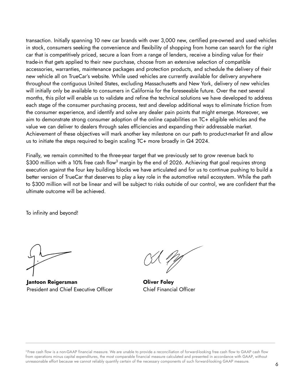 6 Jantoon Reigersman President and Chief Executive Officer Oliver Foley Chief Financial Officer 3 Free cash flow is a non-GAAP financial measure. We are unable to provide a reconciliation of forward-looking free cash flow to GAAP cash flow from operations minus capital expenditures, the most comparable financial measure calculated and presented in accordance with GAAP, without unreasonable effort because we cannot reliably quantify certain of the necessary components of such forward-looking GAAP measure. transaction. Initially spanning 10 new car brands with over 3,000 new, certified pre-owned and used vehicles in stock, consumers seeking the convenience and flexibility of shopping from home can search for the right car that is competitively priced, secure a loan from a range of lenders, receive a binding value for their trade-in that gets applied to their new purchase, choose from an extensive selection of compatible accessories, warranties, maintenance packages and protection products, and schedule the delivery of their new vehicle all on TrueCar’s website. While used vehicles are currently available for delivery anywhere throughout the contiguous United States, excluding Massachusetts and New York, delivery of new vehicles will initially only be available to consumers in California for the foreseeable future. Over the next several months, this pilot will enable us to validate and refine the technical solutions we have developed to address each stage of the consumer purchasing process, test and develop additional ways to eliminate friction from the consumer experience, and identify and solve any dealer pain points that might emerge. Moreover, we aim to demonstrate strong consumer adoption of the online capabilities on TC+ eligible vehicles and the value we can deliver to dealers through sales efficiencies and expanding their addressable market. Achievement of these objectives will mark another key milestone on our path to product-market fit and allow us to initiate the steps required to begin scaling TC+ more broadly in Q4 2024. Finally, we remain committed to the three-year target that we previously set to grow revenue back to $300 million with a 10% free cash flow3 margin by the end of 2026. Achieving that goal requires strong execution against the four key building blocks we have articulated and for us to continue pushing to build a better version of TrueCar that deserves to play a key role in the automotive retail ecosystem. While the path to $300 million will not be linear and will be subject to risks outside of our control, we are confident that the ultimate outcome will be achieved. To infinity and beyond!