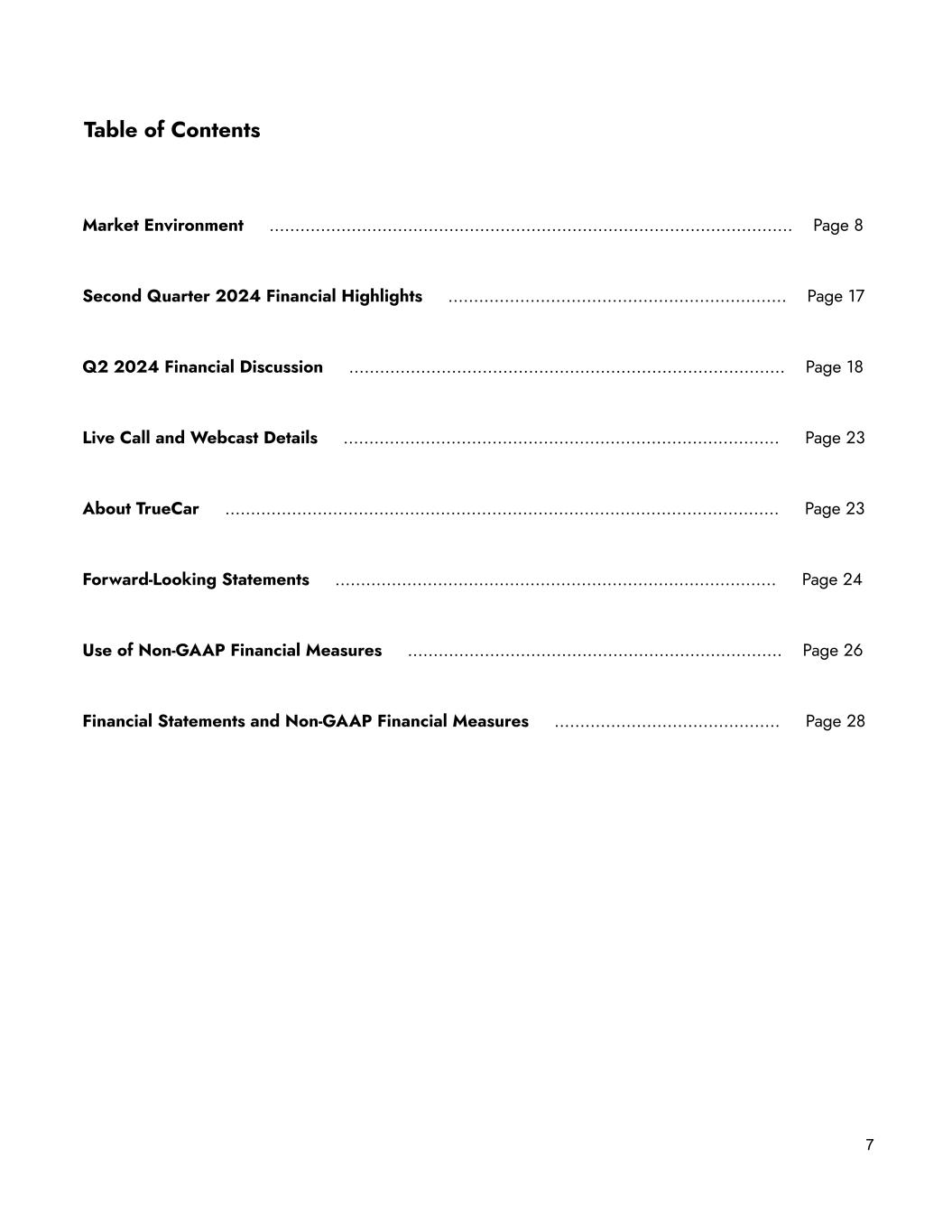 Table of Contents Market Environment ……………………………………………..……………………………..………..… Page 8 Second Quarter 2024 Financial Highlights …………………….…………….……………………. Page 17 Q2 2024 Financial Discussion …………………………………………………….………..…..…..… Page 18 Live Call and Webcast Details ……………….………………………………………….…………..… Page 23 About TrueCar …………………………………………………………………………………...….…..… Page 23 Forward-Looking Statements …………………………………………….……….………….……..… Page 24 Use of Non-GAAP Financial Measures ………………………………………….….……………..… Page 26 Financial Statements and Non-GAAP Financial Measures ……………………………..……… Page 28 7