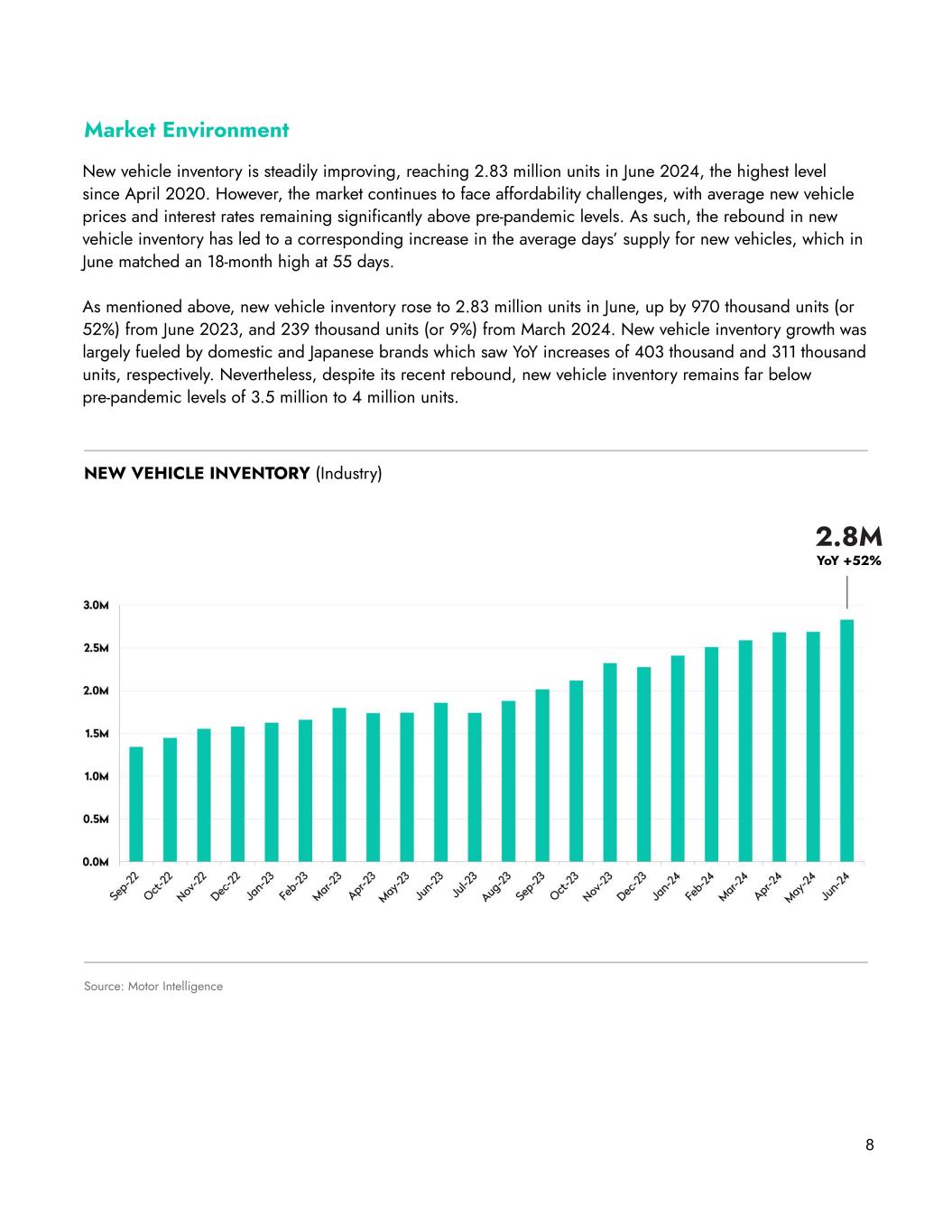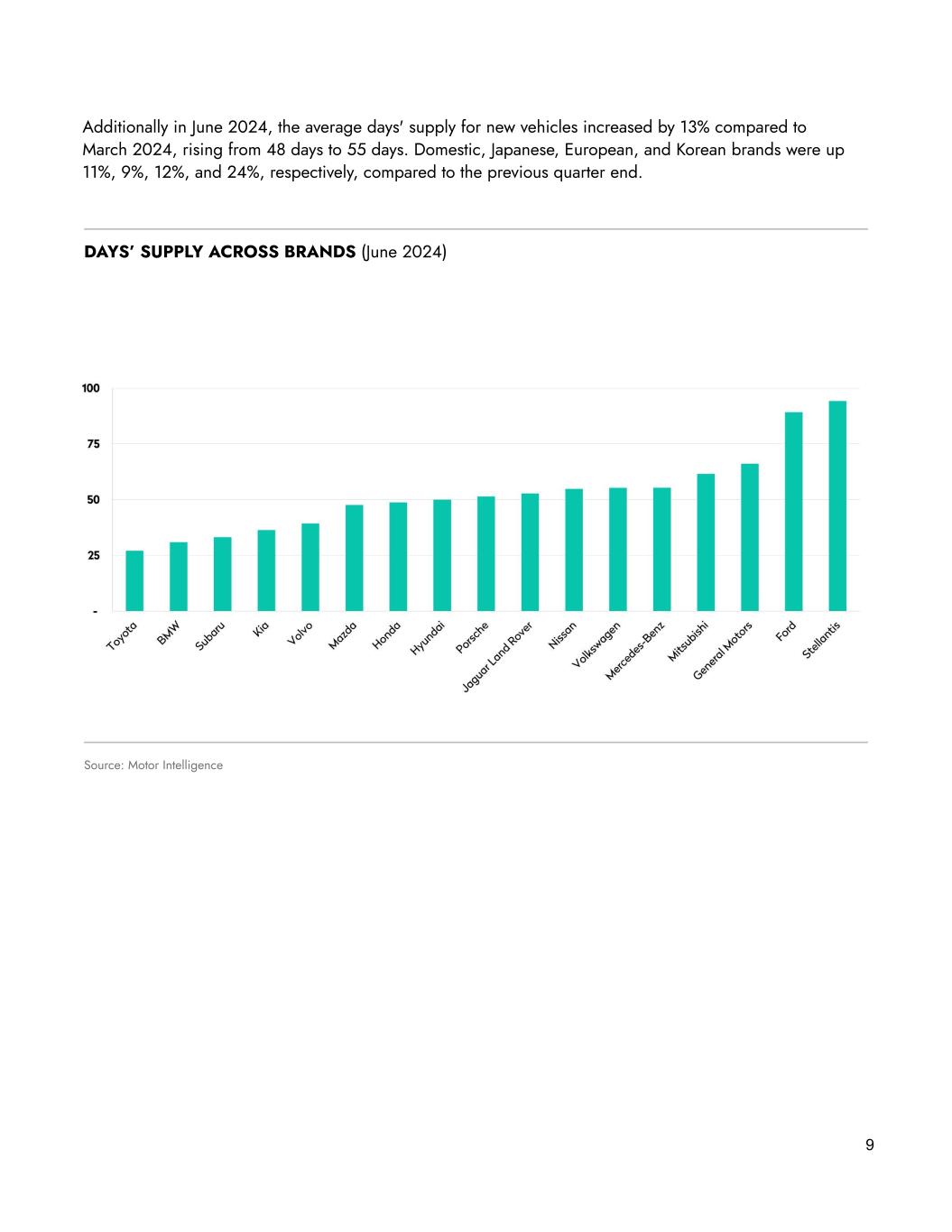 8 Market Environment New vehicle inventory is steadily improving, reaching 2.83 million units in June 2024, the highest level since April 2020. However, the market continues to face affordability challenges, with average new vehicle prices and interest rates remaining significantly above pre-pandemic levels. As such, the rebound in new vehicle inventory has led to a corresponding increase in the average days’ supply for new vehicles, which in June matched an 18-month high at 55 days. As mentioned above, new vehicle inventory rose to 2.83 million units in June, up by 970 thousand units (or 52%) from June 2023, and 239 thousand units (or 9%) from March 2024. New vehicle inventory growth was largely fueled by domestic and Japanese brands which saw YoY increases of 403 thousand and 311 thousand units, respectively. Nevertheless, despite its recent rebound, new vehicle inventory remains far below pre-pandemic levels of 3.5 million to 4 million units. Source: Motor Intelligence NEW VEHICLE INVENTORY (Industry) 2.8M YoY +52%