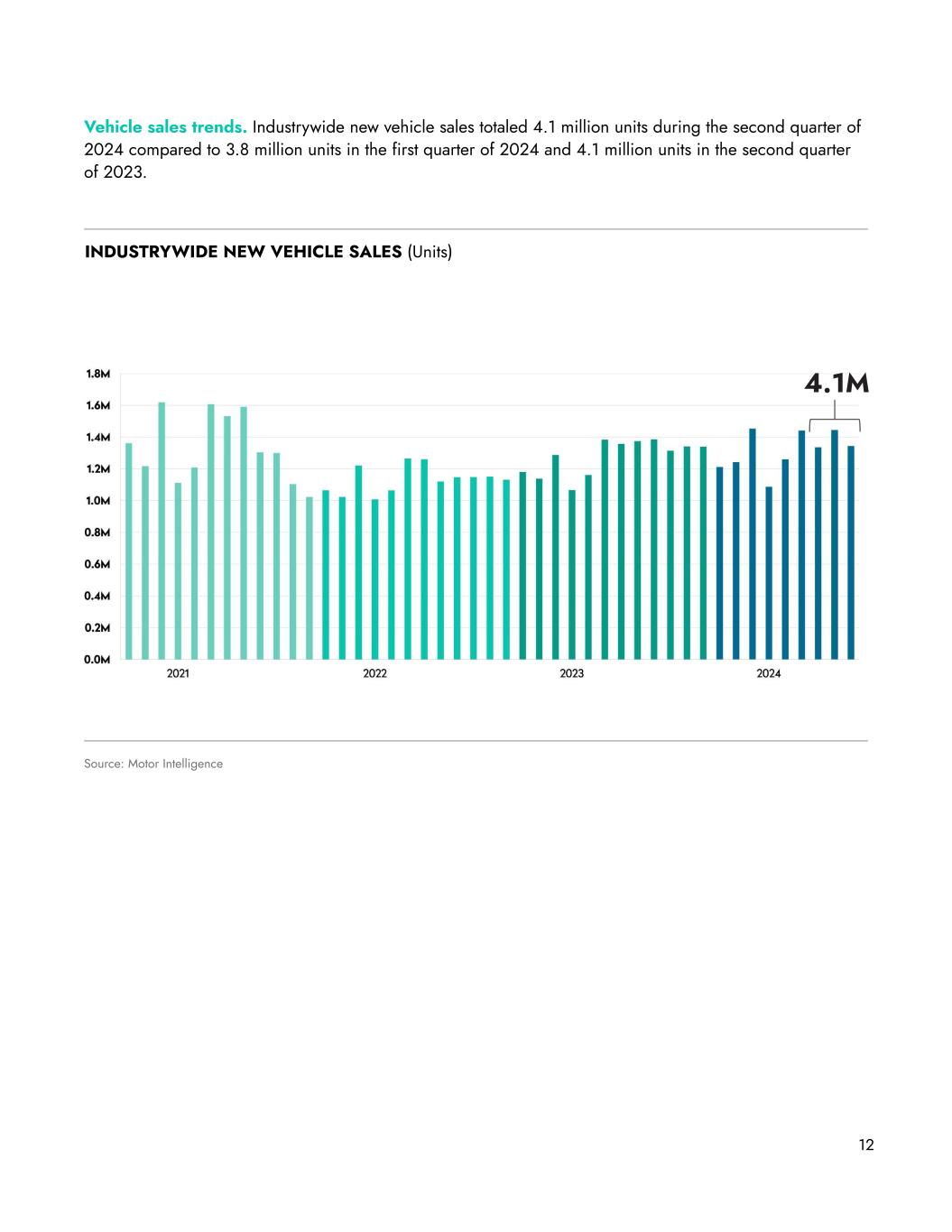 Vehicle sales trends. Industrywide new vehicle sales totaled 4.1 million units during the second quarter of 2024 compared to 3.8 million units in the first quarter of 2024 and 4.1 million units in the second quarter of 2023. 12 INDUSTRYWIDE NEW VEHICLE SALES (Units) Source: Motor Intelligence 4.1M