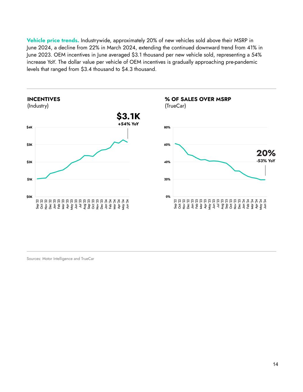 Vehicle price trends. Industrywide, approximately 20% of new vehicles sold above their MSRP in June 2024, a decline from 22% in March 2024, extending the continued downward trend from 41% in June 2023. OEM incentives in June averaged $3.1 thousand per new vehicle sold, representing a 54% increase YoY. The dollar value per vehicle of OEM incentives is gradually approaching pre-pandemic levels that ranged from $3.4 thousand to $4.3 thousand. 14 Sources: Motor Intelligence and TrueCar INCENTIVES (Industry) % OF SALES OVER MSRP (TrueCar) $3.1K +54% YoY 20% -53% YoY