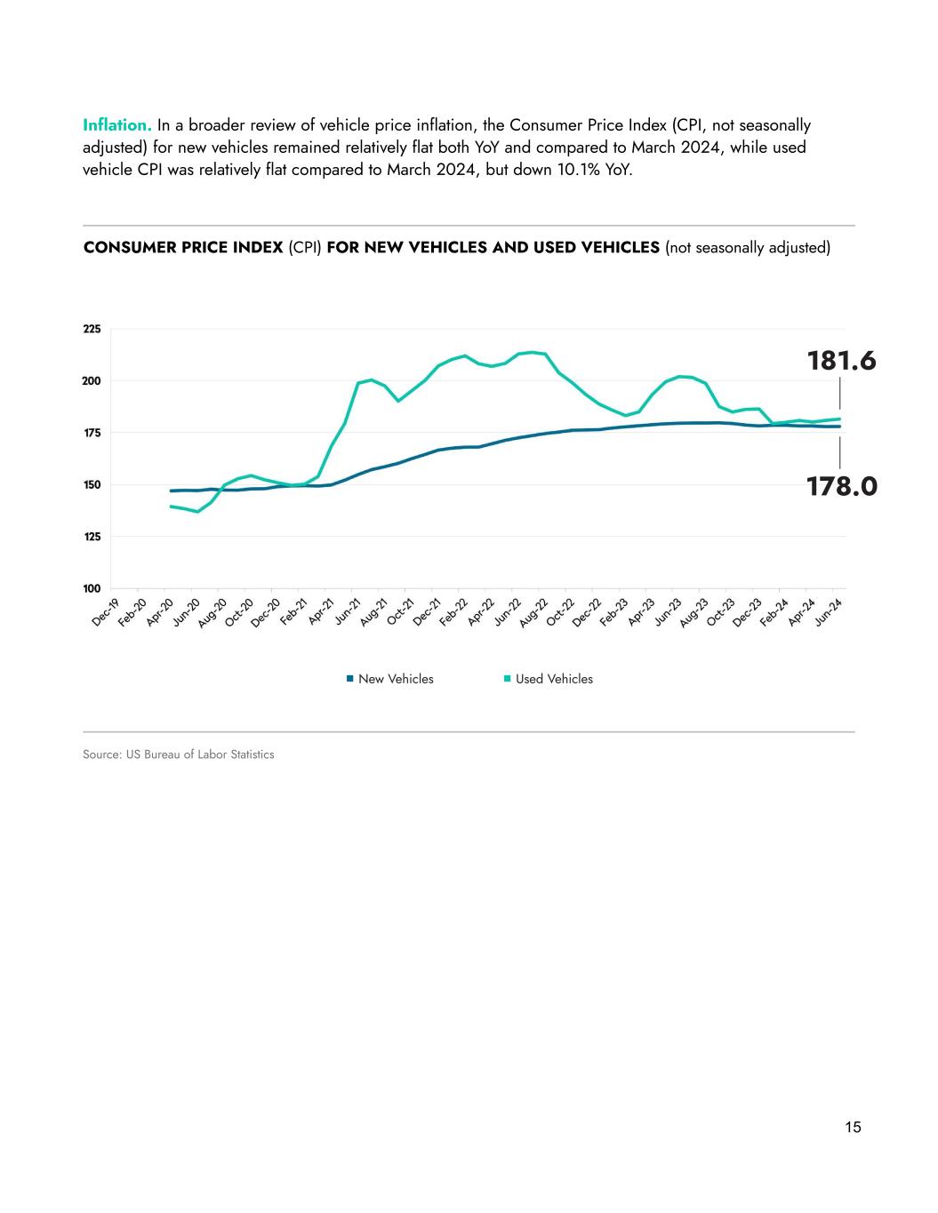 Inflation. In a broader review of vehicle price inflation, the Consumer Price Index (CPI, not seasonally adjusted) for new vehicles remained relatively flat both YoY and compared to March 2024, while used vehicle CPI was relatively flat compared to March 2024, but down 10.1% YoY. 15 Source: US Bureau of Labor Statistics CONSUMER PRICE INDEX (CPI) FOR NEW VEHICLES AND USED VEHICLES (not seasonally adjusted) 181.6 178.0 Used VehiclesNew Vehicles
