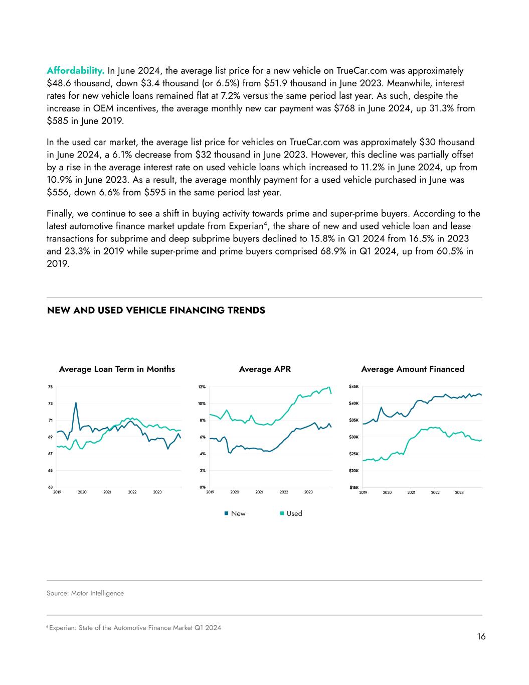Affordability. In June 2024, the average list price for a new vehicle on TrueCar.com was approximately $48.6 thousand, down $3.4 thousand (or 6.5%) from $51.9 thousand in June 2023. Meanwhile, interest rates for new vehicle loans remained flat at 7.2% versus the same period last year. As such, despite the increase in OEM incentives, the average monthly new car payment was $768 in June 2024, up 31.3% from $585 in June 2019. In the used car market, the average list price for vehicles on TrueCar.com was approximately $30 thousand in June 2024, a 6.1% decrease from $32 thousand in June 2023. However, this decline was partially offset by a rise in the average interest rate on used vehicle loans which increased to 11.2% in June 2024, up from 10.9% in June 2023. As a result, the average monthly payment for a used vehicle purchased in June was $556, down 6.6% from $595 in the same period last year. Finally, we continue to see a shift in buying activity towards prime and super-prime buyers. According to the latest automotive finance market update from Experian4, the share of new and used vehicle loan and lease transactions for subprime and deep subprime buyers declined to 15.8% in Q1 2024 from 16.5% in 2023 and 23.3% in 2019 while super-prime and prime buyers comprised 68.9% in Q1 2024, up from 60.5% in 2019. 16 4 Experian: State of the Automotive Finance Market Q1 2024 NEW AND USED VEHICLE FINANCING TRENDS Source: Motor Intelligence UsedNew Average Loan Term in Months Average APR Average Amount Financed