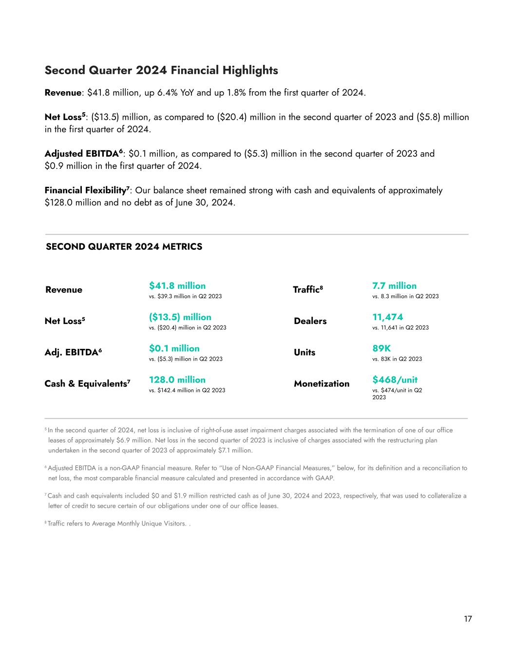 17 Second Quarter 2024 Financial Highlights Revenue: $41.8 million, up 6.4% YoY and up 1.8% from the first quarter of 2024. Net Loss5: ($13.5) million, as compared to ($20.4) million in the second quarter of 2023 and ($5.8) million in the first quarter of 2024. Adjusted EBITDA6: $0.1 million, as compared to ($5.3) million in the second quarter of 2023 and $0.9 million in the first quarter of 2024. Financial Flexibility7: Our balance sheet remained strong with cash and equivalents of approximately $128.0 million and no debt as of June 30, 2024. Revenue $41.8 million vs. $39.3 million in Q2 2023 Traffic8 7.7 million vs. 8.3 million in Q2 2023 Net Loss5 ($13.5) million vs. ($20.4) million in Q2 2023 Dealers 11,474 vs. 11,641 in Q2 2023 Adj. EBITDA6 $0.1 million vs. ($5.3) million in Q2 2023 Units 89K vs. 83K in Q2 2023 Cash & Equivalents7 128.0 million vs. $142.4 million in Q2 2023 Monetization $468/unit vs. $474/unit in Q2 2023 5 In the second quarter of 2024, net loss is inclusive of right-of-use asset impairment charges associated with the termination of one of our office leases of approximately $6.9 million. Net loss in the second quarter of 2023 is inclusive of charges associated with the restructuring plan undertaken in the second quarter of 2023 of approximately $7.1 million. 6 Adjusted EBITDA is a non-GAAP financial measure. Refer to “Use of Non-GAAP Financial Measures,” below, for its definition and a reconciliation to net loss, the most comparable financial measure calculated and presented in accordance with GAAP. 7 Cash and cash equivalents included $0 and $1.9 million restricted cash as of June 30, 2024 and 2023, respectively, that was used to collateralize a letter of credit to secure certain of our obligations under one of our office leases. 8 Traffic refers to Average Monthly Unique Visitors. . SECOND QUARTER 2024 METRICS