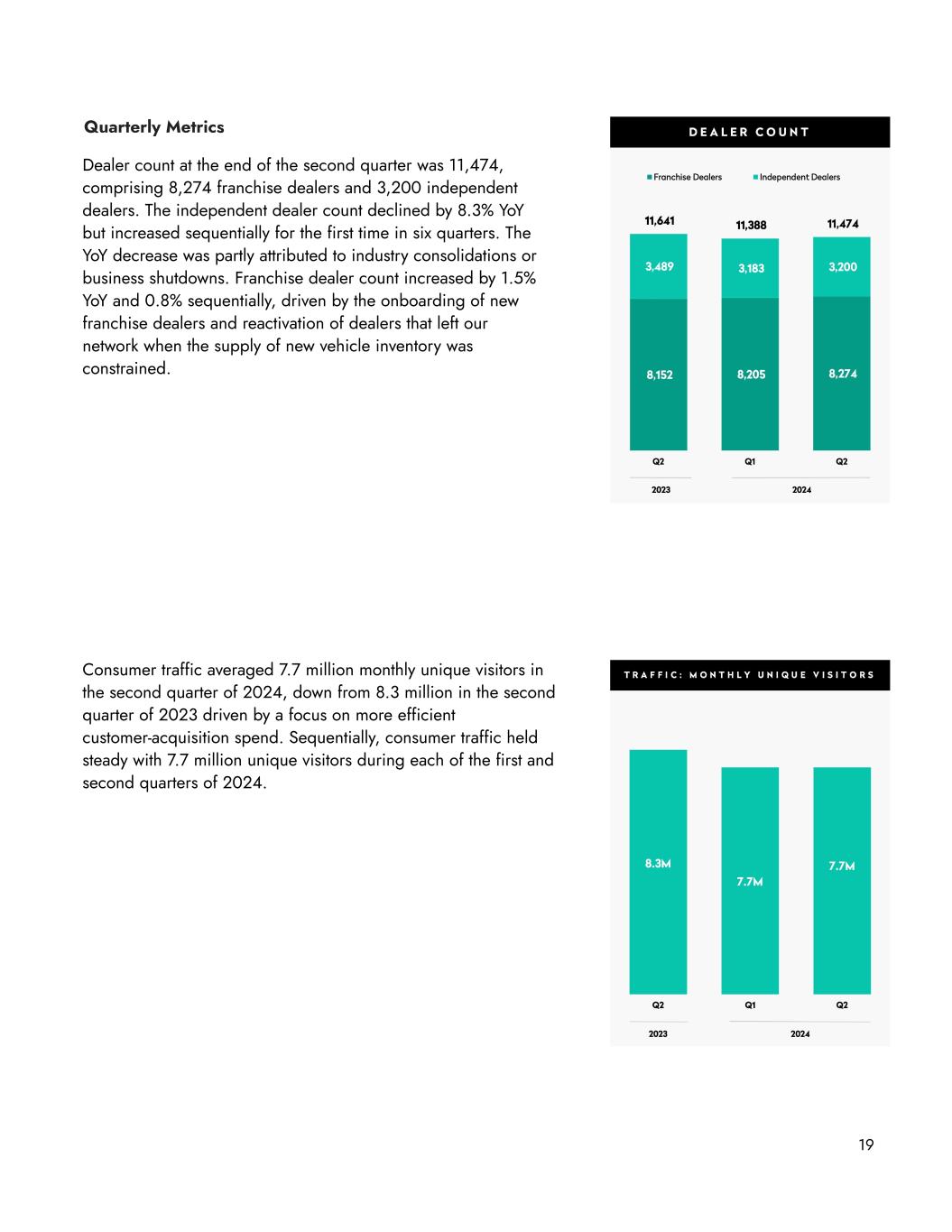Quarterly Metrics Dealer count at the end of the second quarter was 11,474, comprising 8,274 franchise dealers and 3,200 independent dealers. The independent dealer count declined by 8.3% YoY but increased sequentially for the first time in six quarters. The YoY decrease was partly attributed to industry consolidations or business shutdowns. Franchise dealer count increased by 1.5% YoY and 0.8% sequentially, driven by the onboarding of new franchise dealers and reactivation of dealers that left our network when the supply of new vehicle inventory was constrained. Consumer traffic averaged 7.7 million monthly unique visitors in the second quarter of 2024, down from 8.3 million in the second quarter of 2023 driven by a focus on more efficient customer-acquisition spend. Sequentially, consumer traffic held steady with 7.7 million unique visitors during each of the first and second quarters of 2024. 19