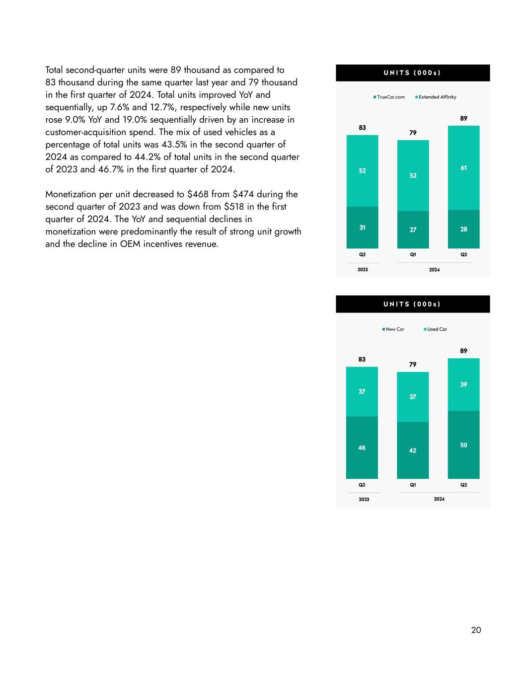 20 Total second-quarter units were 89 thousand as compared to 83 thousand during the same quarter last year and 79 thousand in the first quarter of 2024. Total units improved YoY and sequentially, up 7.6% and 12.7%, respectively while new units rose 9.0% YoY and 19.0% sequentially driven by an increase in customer-acquisition spend. The mix of used vehicles as a percentage of total units was 43.5% in the second quarter of 2024 as compared to 44.2% of total units in the second quarter of 2023 and 46.7% in the first quarter of 2024. Monetization per unit decreased to $468 from $474 during the second quarter of 2023 and was down from $518 in the first quarter of 2024. The YoY and sequential declines in monetization were predominantly the result of strong unit growth and the decline in OEM incentives revenue.