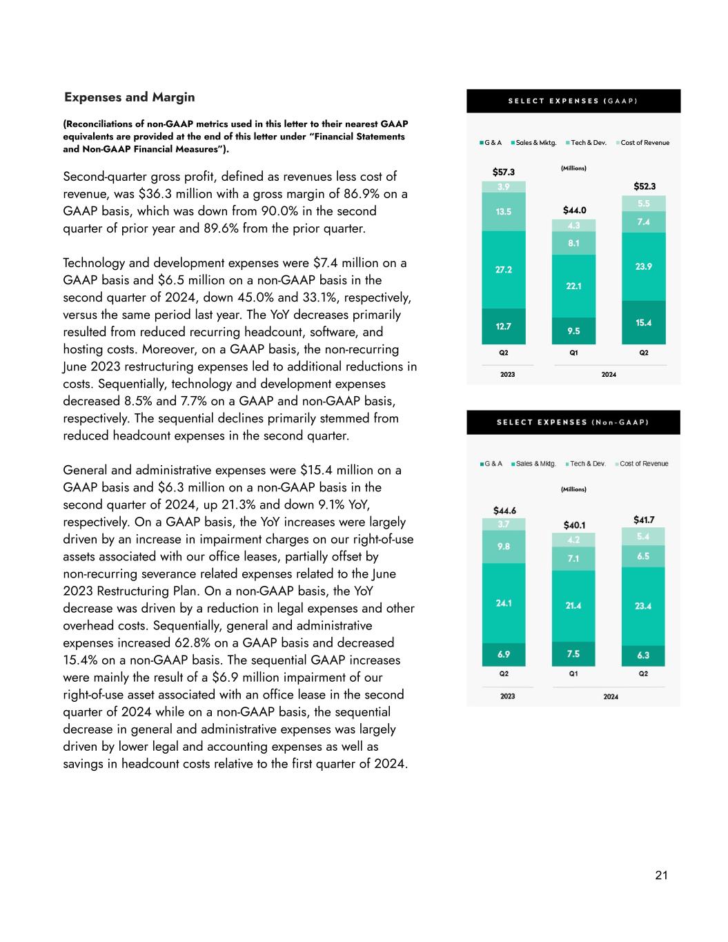 21 Expenses and Margin (Reconciliations of non-GAAP metrics used in this letter to their nearest GAAP equivalents are provided at the end of this letter under “Financial Statements and Non-GAAP Financial Measures”). Second-quarter gross profit, defined as revenues less cost of revenue, was $36.3 million with a gross margin of 86.9% on a GAAP basis, which was down from 90.0% in the second quarter of prior year and 89.6% from the prior quarter. Technology and development expenses were $7.4 million on a GAAP basis and $6.5 million on a non-GAAP basis in the second quarter of 2024, down 45.0% and 33.1%, respectively, versus the same period last year. The YoY decreases primarily resulted from reduced recurring headcount, software, and hosting costs. Moreover, on a GAAP basis, the non-recurring June 2023 restructuring expenses led to additional reductions in costs. Sequentially, technology and development expenses decreased 8.5% and 7.7% on a GAAP and non-GAAP basis, respectively. The sequential declines primarily stemmed from reduced headcount expenses in the second quarter. General and administrative expenses were $15.4 million on a GAAP basis and $6.3 million on a non-GAAP basis in the second quarter of 2024, up 21.3% and down 9.1% YoY, respectively. On a GAAP basis, the YoY increases were largely driven by an increase in impairment charges on our right-of-use assets associated with our office leases, partially offset by non-recurring severance related expenses related to the June 2023 Restructuring Plan. On a non-GAAP basis, the YoY decrease was driven by a reduction in legal expenses and other overhead costs. Sequentially, general and administrative expenses increased 62.8% on a GAAP basis and decreased 15.4% on a non-GAAP basis. The sequential GAAP increases were mainly the result of a $6.9 million impairment of our right-of-use asset associated with an office lease in the second quarter of 2024 while on a non-GAAP basis, the sequential decrease in general and administrative expenses was largely driven by lower legal and accounting expenses as well as savings in headcount costs relative to the first quarter of 2024. (Millions) (Millions)