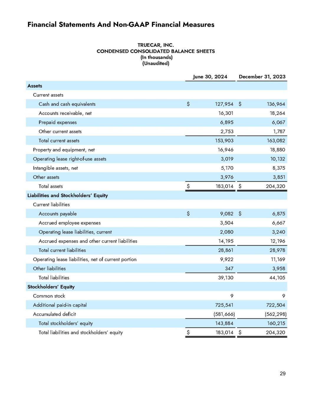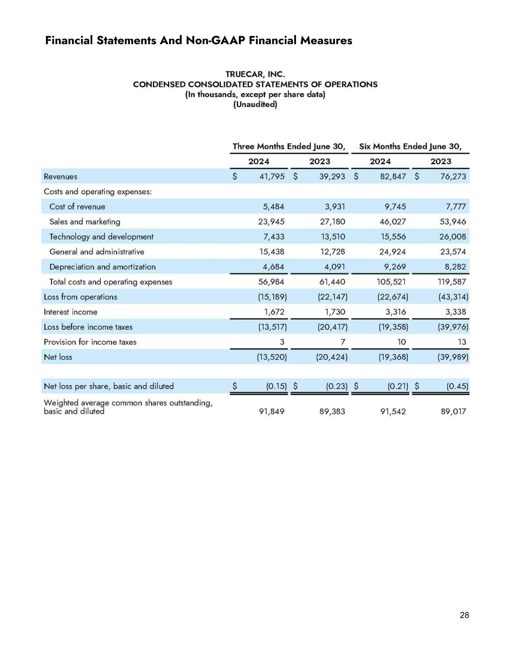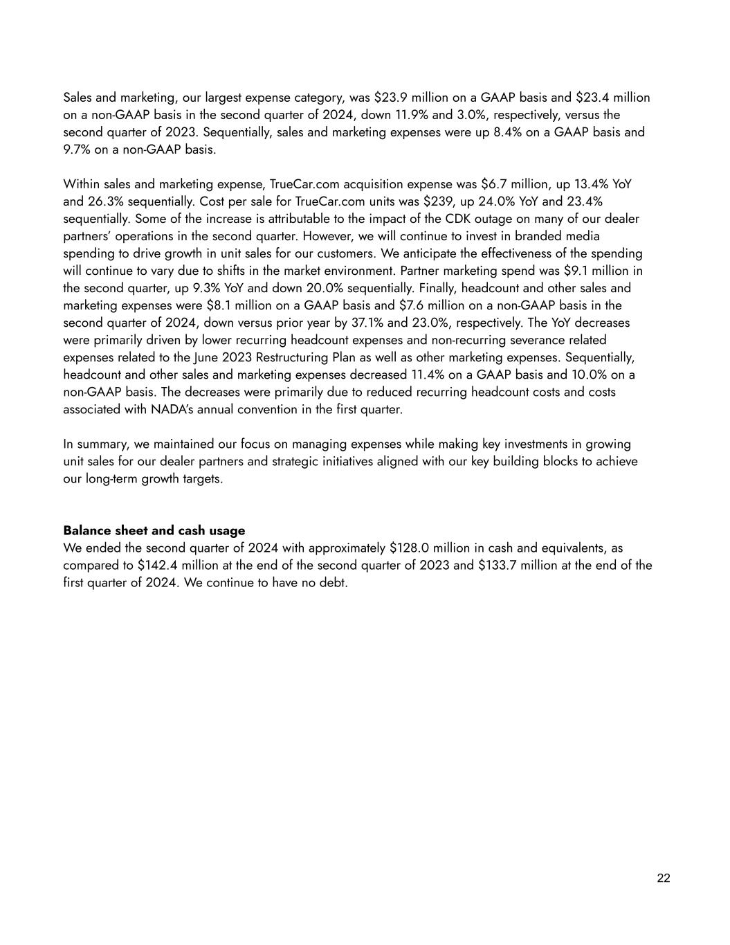 22 Sales and marketing, our largest expense category, was $23.9 million on a GAAP basis and $23.4 million on a non-GAAP basis in the second quarter of 2024, down 11.9% and 3.0%, respectively, versus the second quarter of 2023. Sequentially, sales and marketing expenses were up 8.4% on a GAAP basis and 9.7% on a non-GAAP basis. Within sales and marketing expense, TrueCar.com acquisition expense was $6.7 million, up 13.4% YoY and 26.3% sequentially. Cost per sale for TrueCar.com units was $239, up 24.0% YoY and 23.4% sequentially. Some of the increase is attributable to the impact of the CDK outage on many of our dealer partners’ operations in the second quarter. However, we will continue to invest in branded media spending to drive growth in unit sales for our customers. We anticipate the effectiveness of the spending will continue to vary due to shifts in the market environment. Partner marketing spend was $9.1 million in the second quarter, up 9.3% YoY and down 20.0% sequentially. Finally, headcount and other sales and marketing expenses were $8.1 million on a GAAP basis and $7.6 million on a non-GAAP basis in the second quarter of 2024, down versus prior year by 37.1% and 23.0%, respectively. The YoY decreases were primarily driven by lower recurring headcount expenses and non-recurring severance related expenses related to the June 2023 Restructuring Plan as well as other marketing expenses. Sequentially, headcount and other sales and marketing expenses decreased 11.4% on a GAAP basis and 10.0% on a non-GAAP basis. The decreases were primarily due to reduced recurring headcount costs and costs associated with NADA’s annual convention in the first quarter. In summary, we maintained our focus on managing expenses while making key investments in growing unit sales for our dealer partners and strategic initiatives aligned with our key building blocks to achieve our long-term growth targets. Balance sheet and cash usage We ended the second quarter of 2024 with approximately $128.0 million in cash and equivalents, as compared to $142.4 million at the end of the second quarter of 2023 and $133.7 million at the end of the first quarter of 2024. We continue to have no debt.