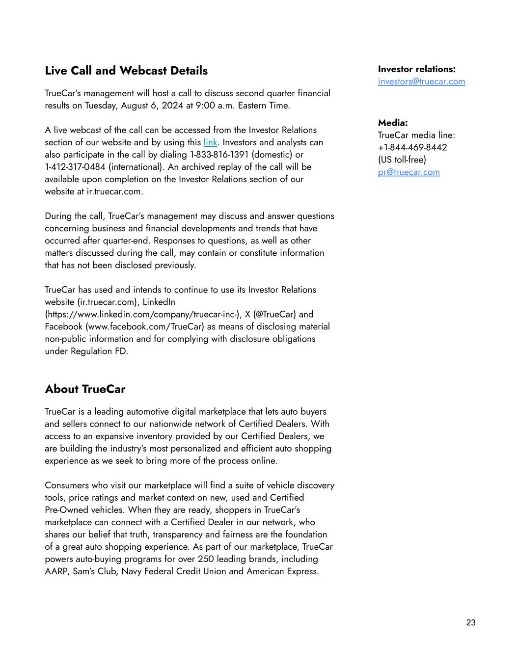 23 Investor relations: investors@truecar.com Media: TrueCar media line: +1-844-469-8442 (US toll-free) pr@truecar.com Live Call and Webcast Details TrueCar’s management will host a call to discuss second quarter financial results on Tuesday, August 6, 2024 at 9:00 a.m. Eastern Time. A live webcast of the call can be accessed from the Investor Relations section of our website and by using this link. Investors and analysts can also participate in the call by dialing 1-833-816-1391 (domestic) or 1-412-317-0484 (international). An archived replay of the call will be available upon completion on the Investor Relations section of our website at ir.truecar.com. During the call, TrueCar’s management may discuss and answer questions concerning business and financial developments and trends that have occurred after quarter-end. Responses to questions, as well as other matters discussed during the call, may contain or constitute information that has not been disclosed previously. TrueCar has used and intends to continue to use its Investor Relations website (ir.truecar.com), LinkedIn (https://www.linkedin.com/company/truecar-inc-), X (@TrueCar) and Facebook (www.facebook.com/TrueCar) as means of disclosing material non-public information and for complying with disclosure obligations under Regulation FD. About TrueCar TrueCar is a leading automotive digital marketplace that lets auto buyers and sellers connect to our nationwide network of Certified Dealers. With access to an expansive inventory provided by our Certified Dealers, we are building the industry’s most personalized and efficient auto shopping experience as we seek to bring more of the process online. Consumers who visit our marketplace will find a suite of vehicle discovery tools, price ratings and market context on new, used and Certified Pre-Owned vehicles. When they are ready, shoppers in TrueCar’s marketplace can connect with a Certified Dealer in our network, who shares our belief that truth, transparency and fairness are the foundation of a great auto shopping experience. As part of our marketplace, TrueCar powers auto-buying programs for over 250 leading brands, including AARP, Sam’s Club, Navy Federal Credit Union and American Express.