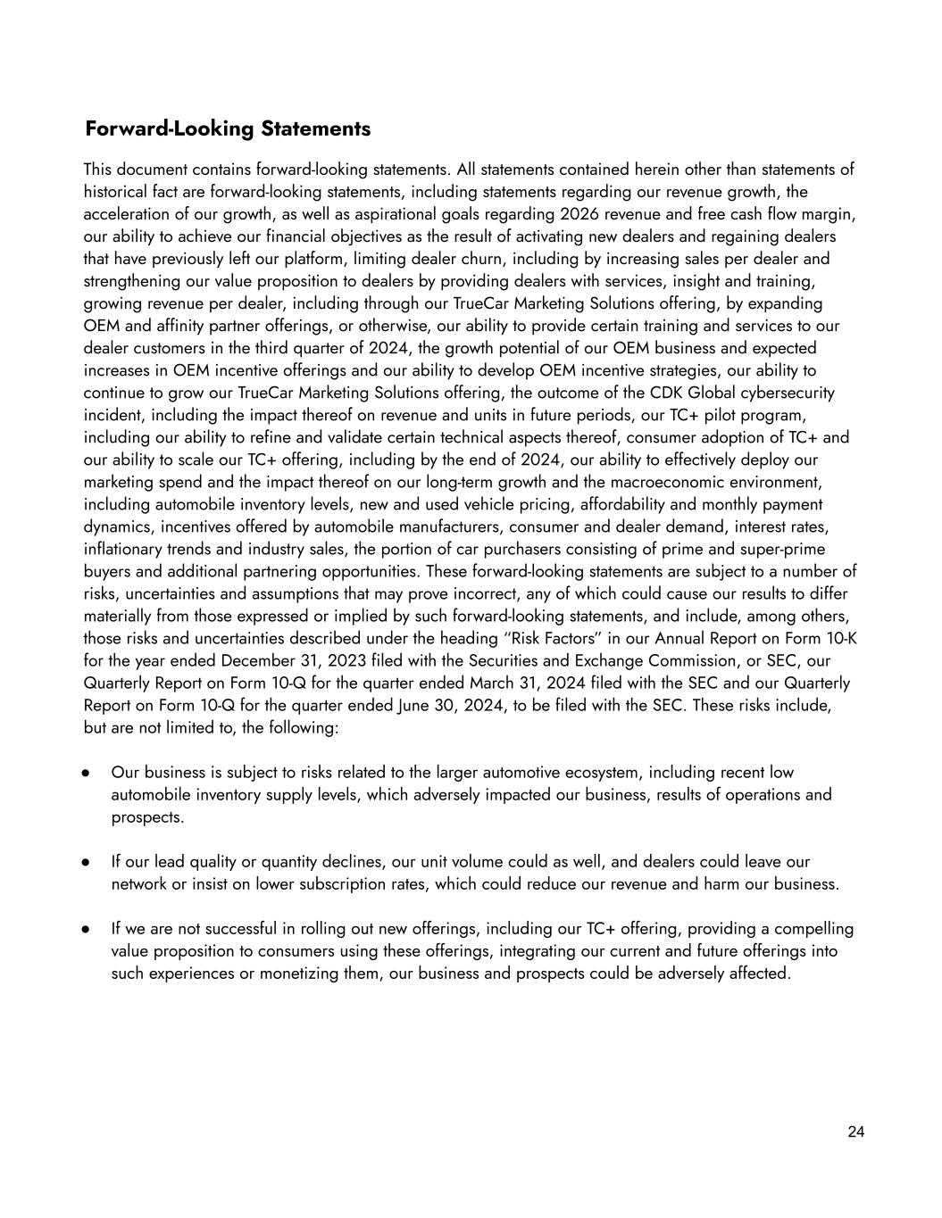 24 Forward-Looking Statements This document contains forward-looking statements. All statements contained herein other than statements of historical fact are forward-looking statements, including statements regarding our revenue growth, the acceleration of our growth, as well as aspirational goals regarding 2026 revenue and free cash flow margin, our ability to achieve our financial objectives as the result of activating new dealers and regaining dealers that have previously left our platform, limiting dealer churn, including by increasing sales per dealer and strengthening our value proposition to dealers by providing dealers with services, insight and training, growing revenue per dealer, including through our TrueCar Marketing Solutions offering, by expanding OEM and affinity partner offerings, or otherwise, our ability to provide certain training and services to our dealer customers in the third quarter of 2024, the growth potential of our OEM business and expected increases in OEM incentive offerings and our ability to develop OEM incentive strategies, our ability to continue to grow our TrueCar Marketing Solutions offering, the outcome of the CDK Global cybersecurity incident, including the impact thereof on revenue and units in future periods, our TC+ pilot program, including our ability to refine and validate certain technical aspects thereof, consumer adoption of TC+ and our ability to scale our TC+ offering, including by the end of 2024, our ability to effectively deploy our marketing spend and the impact thereof on our long-term growth and the macroeconomic environment, including automobile inventory levels, new and used vehicle pricing, affordability and monthly payment dynamics, incentives offered by automobile manufacturers, consumer and dealer demand, interest rates, inflationary trends and industry sales, the portion of car purchasers consisting of prime and super-prime buyers and additional partnering opportunities. These forward-looking statements are subject to a number of risks, uncertainties and assumptions that may prove incorrect, any of which could cause our results to differ materially from those expressed or implied by such forward-looking statements, and include, among others, those risks and uncertainties described under the heading “Risk Factors” in our Annual Report on Form 10-K for the year ended December 31, 2023 filed with the Securities and Exchange Commission, or SEC, our Quarterly Report on Form 10-Q for the quarter ended March 31, 2024 filed with the SEC and our Quarterly Report on Form 10-Q for the quarter ended June 30, 2024, to be filed with the SEC. These risks include, but are not limited to, the following: ● Our business is subject to risks related to the larger automotive ecosystem, including recent low automobile inventory supply levels, which adversely impacted our business, results of operations and prospects. ● If our lead quality or quantity declines, our unit volume could as well, and dealers could leave our network or insist on lower subscription rates, which could reduce our revenue and harm our business. ● If we are not successful in rolling out new offerings, including our TC+ offering, providing a compelling value proposition to consumers using these offerings, integrating our current and future offerings into such experiences or monetizing them, our business and prospects could be adversely affected.