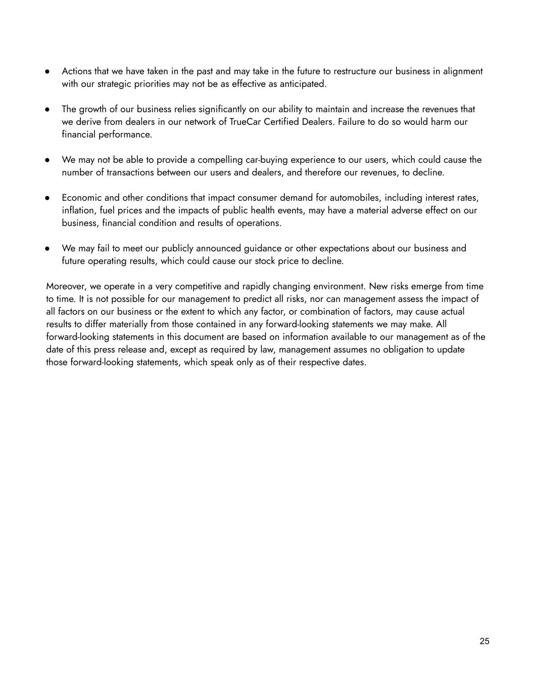 25 ● Actions that we have taken in the past and may take in the future to restructure our business in alignment with our strategic priorities may not be as effective as anticipated. ● The growth of our business relies significantly on our ability to maintain and increase the revenues that we derive from dealers in our network of TrueCar Certified Dealers. Failure to do so would harm our financial performance. ● We may not be able to provide a compelling car-buying experience to our users, which could cause the number of transactions between our users and dealers, and therefore our revenues, to decline. ● Economic and other conditions that impact consumer demand for automobiles, including interest rates, inflation, fuel prices and the impacts of public health events, may have a material adverse effect on our business, financial condition and results of operations. ● We may fail to meet our publicly announced guidance or other expectations about our business and future operating results, which could cause our stock price to decline. Moreover, we operate in a very competitive and rapidly changing environment. New risks emerge from time to time. It is not possible for our management to predict all risks, nor can management assess the impact of all factors on our business or the extent to which any factor, or combination of factors, may cause actual results to differ materially from those contained in any forward-looking statements we may make. All forward-looking statements in this document are based on information available to our management as of the date of this press release and, except as required by law, management assumes no obligation to update those forward-looking statements, which speak only as of their respective dates.