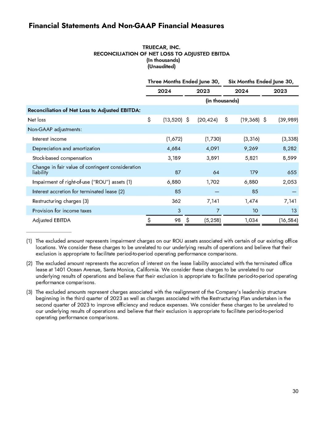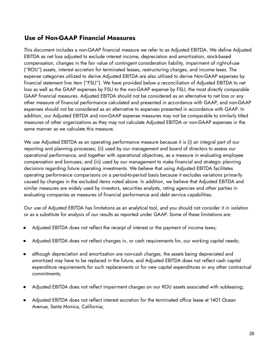 Use of Non-GAAP Financial Measures This document includes a non-GAAP financial measure we refer to as Adjusted EBITDA. We define Adjusted EBITDA as net loss adjusted to exclude interest income, depreciation and amortization, stock-based compensation, changes in the fair value of contingent consideration liability, impairment of right-of-use (“ROU”) assets, interest accretion for terminated leases, restructuring charges, and income taxes. The expense categories utilized to derive Adjusted EBITDA are also utilized to derive Non-GAAP expenses by financial statement line item (“FSLI”). We have provided below a reconciliation of Adjusted EBITDA to net loss as well as the GAAP expenses by FSLI to the non-GAAP expense by FSLI, the most directly comparable GAAP financial measures. Adjusted EBITDA should not be considered as an alternative to net loss or any other measure of financial performance calculated and presented in accordance with GAAP, and non-GAAP expenses should not be considered as an alternative to expenses presented in accordance with GAAP. In addition, our Adjusted EBITDA and non-GAAP expense measures may not be comparable to similarly titled measures of other organizations as they may not calculate Adjusted EBITDA or non-GAAP expenses in the same manner as we calculate this measure. We use Adjusted EBITDA as an operating performance measure because it is (i) an integral part of our reporting and planning processes; (ii) used by our management and board of directors to assess our operational performance, and together with operational objectives, as a measure in evaluating employee compensation and bonuses; and (iii) used by our management to make financial and strategic planning decisions regarding future operating investments. We believe that using Adjusted EBITDA facilitates operating performance comparisons on a period-to-period basis because it excludes variations primarily caused by changes in the excluded items noted above. In addition, we believe that Adjusted EBITDA and similar measures are widely used by investors, securities analysts, rating agencies and other parties in evaluating companies as measures of financial performance and debt service capabilities. Our use of Adjusted EBITDA has limitations as an analytical tool, and you should not consider it in isolation or as a substitute for analysis of our results as reported under GAAP. Some of these limitations are: ● Adjusted EBITDA does not reflect the receipt of interest or the payment of income taxes; ● Adjusted EBITDA does not reflect changes in, or cash requirements for, our working capital needs; ● although depreciation and amortization are non-cash charges, the assets being depreciated and amortized may have to be replaced in the future, and Adjusted EBITDA does not reflect cash capital expenditure requirements for such replacements or for new capital expenditures or any other contractual commitments; ● Adjusted EBITDA does not reflect impairment charges on our ROU assets associated with subleasing; ● Adjusted EBITDA does not reflect interest accretion for the terminated office lease at 1401 Ocean Avenue, Santa Monica, California; 26
